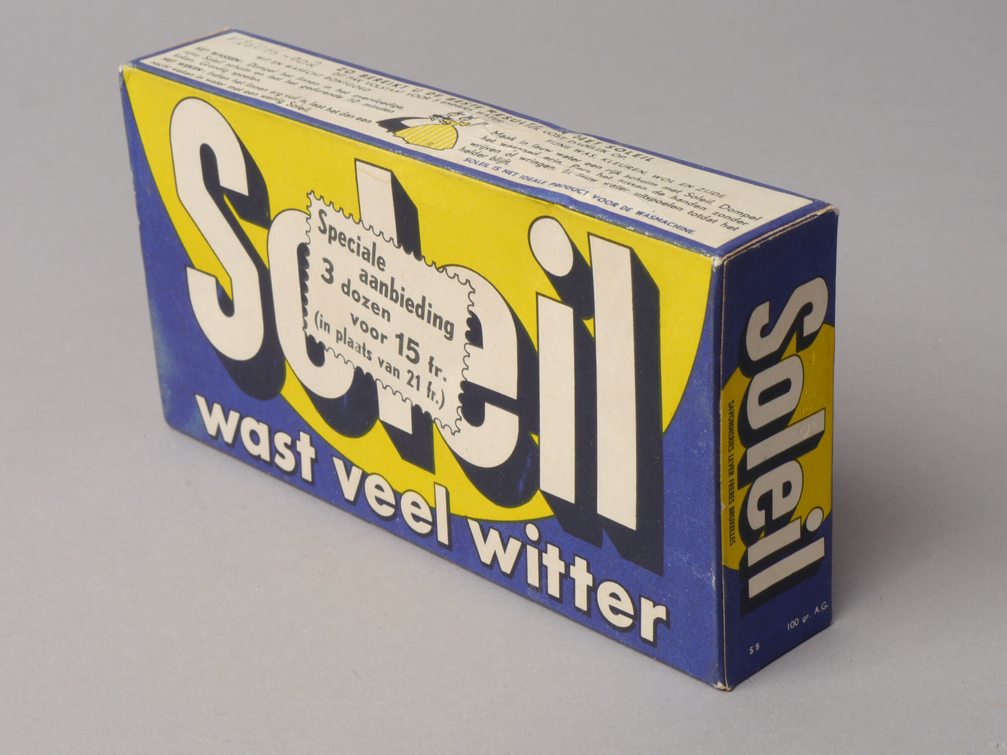 - opschriften: Soleil / wast veel witter / Speciale aanbieding / 3 dozen voor 15 fr. (in plaats van 21 fr.)