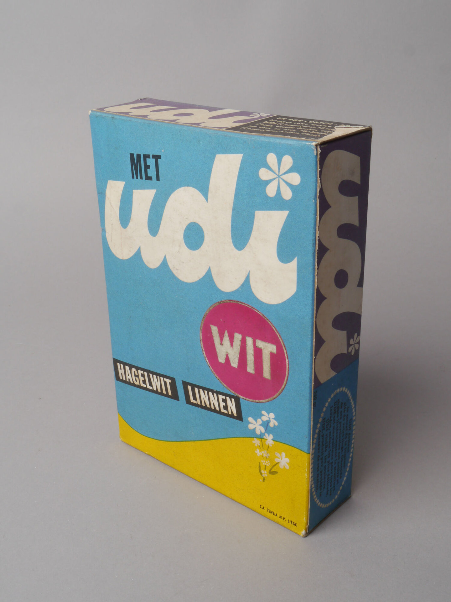 - opschriften: MET / udi / WIT / HAGELWIT LINNEN // UDI kent het geheim van de helderheid van uw linnen. / Het heeft een krachtige werking tot in zijn kleinste onderdeeltjes en verdrijft letterlijk het vuil. UDI is buitengewoon, zelfs voor de fijnste was. / UDI verleven