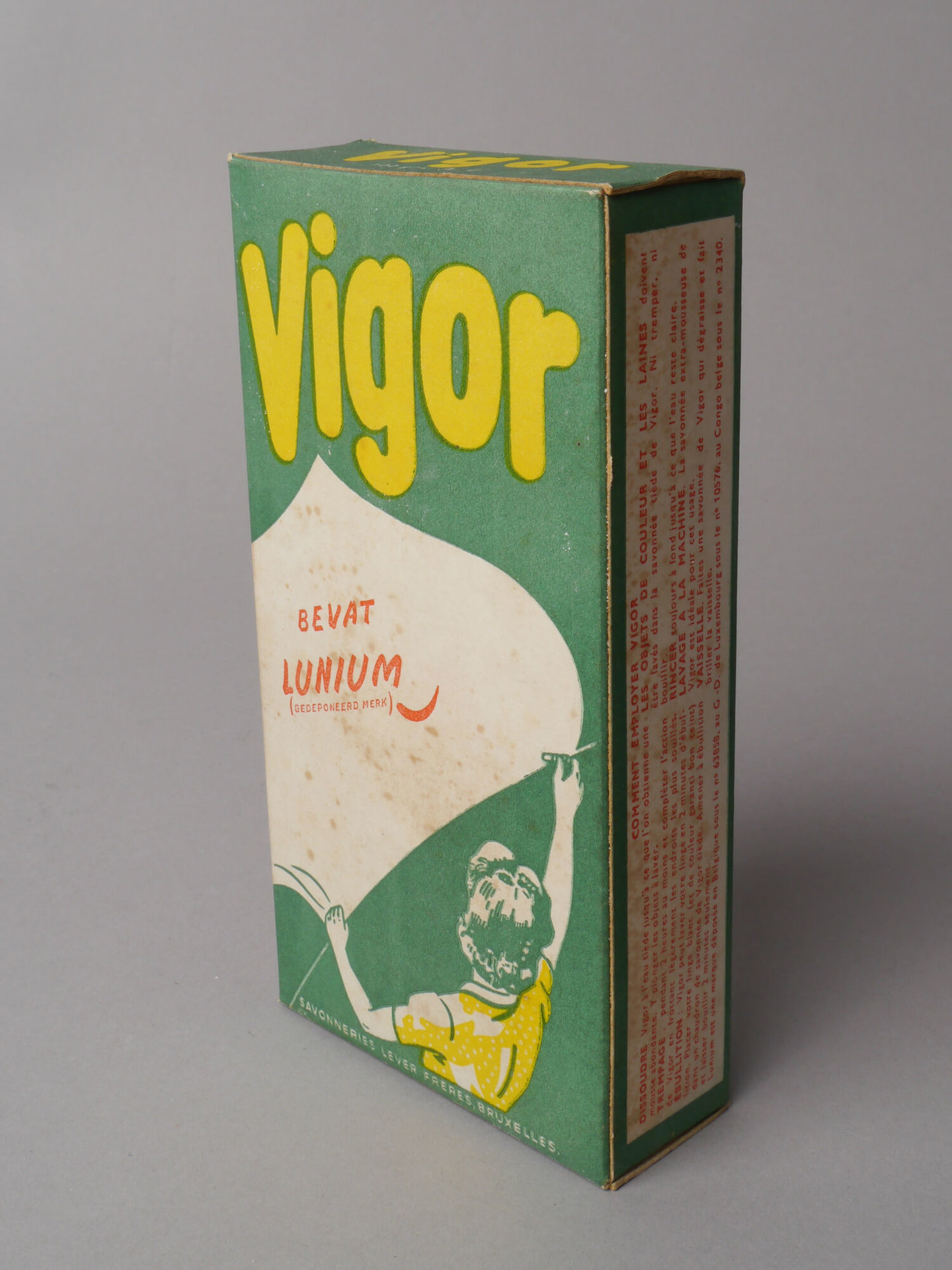 - opschriften: Vigor / bevat / LUNIUM / (gedeponeerd merk) / SAVONNERIES LEVER FRÈRES, BRUXELLES // Vigor / 100 grs. A. G.