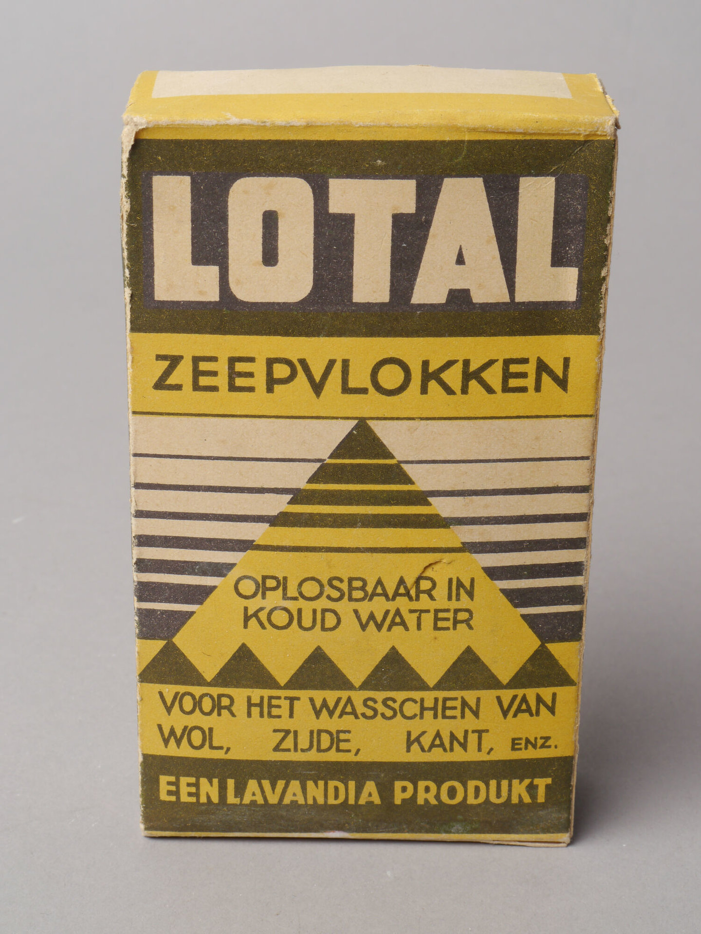 - opschriften: LOTAL / ZEEPVLOKKEN / OPLOSBAAR IN / KOUD WATER / VOOR HET WASSCHEN VAN / WOL, ZIJDE, KANT, ENZ. / EEN LAVANDIA PRODUKT