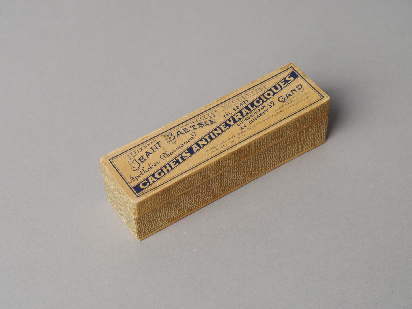 - opschriften: Jean Baetslé / Apotheker - Pharmacien Tel 52.623 / cachets antinevralgiques / Elisabethlaan / Av. Elisabeth 52 / Gand / MUR. MAG. OPii. 0,003 gr. - DIMETHYL. OXY. - ACETYL. P. PHENIT. - NA. BIC.