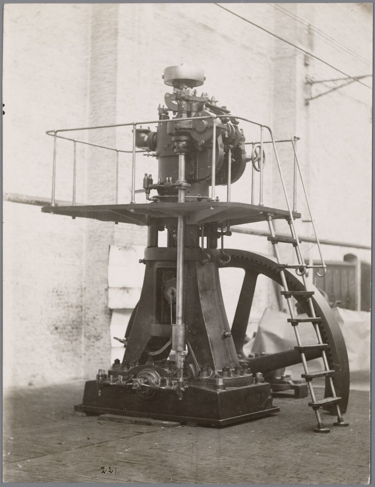 Zicht op de eerste dieselmotor gebouwd in Gent. Het beeld komt uit het bedrijfsarchief van bouwfirma Serck nv. Deze verticale, mono- of ééncilinder dieselmotor staat klaar voor transport of montage op de testbank.