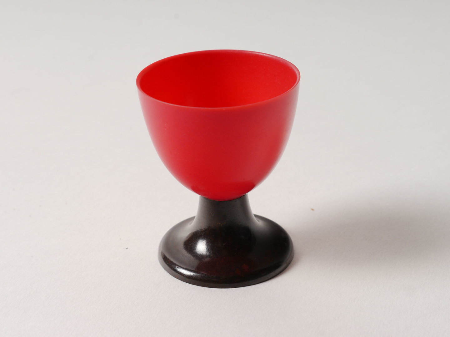Eierdopje uit rode kunststof, vermoedelijk ureumformaldehyde, op een voet uit zwart fenolhars (bakeliet).