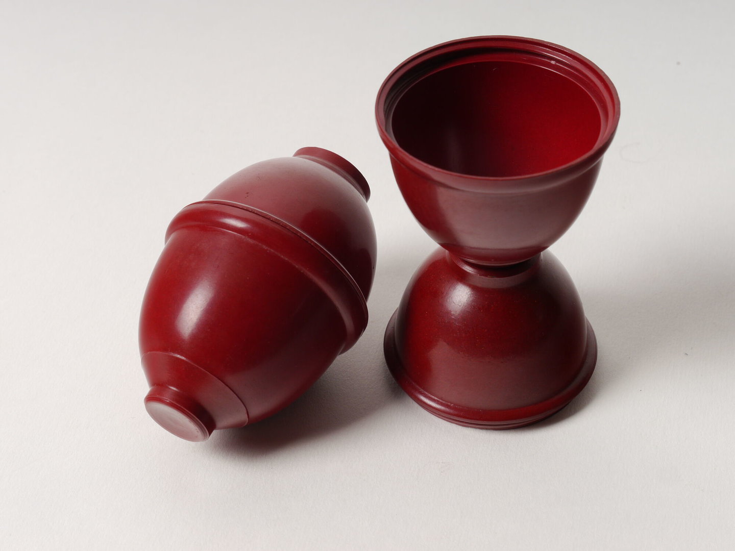 Eivormige dozen die een ei kunnen bevatten. Losgeschroefd kunnen de twee delen op elkaar worden gezet om een eierdopje te vormen. Geperst uit donkerrood fenolhars (bakeliet) of ureumformaldehyde.