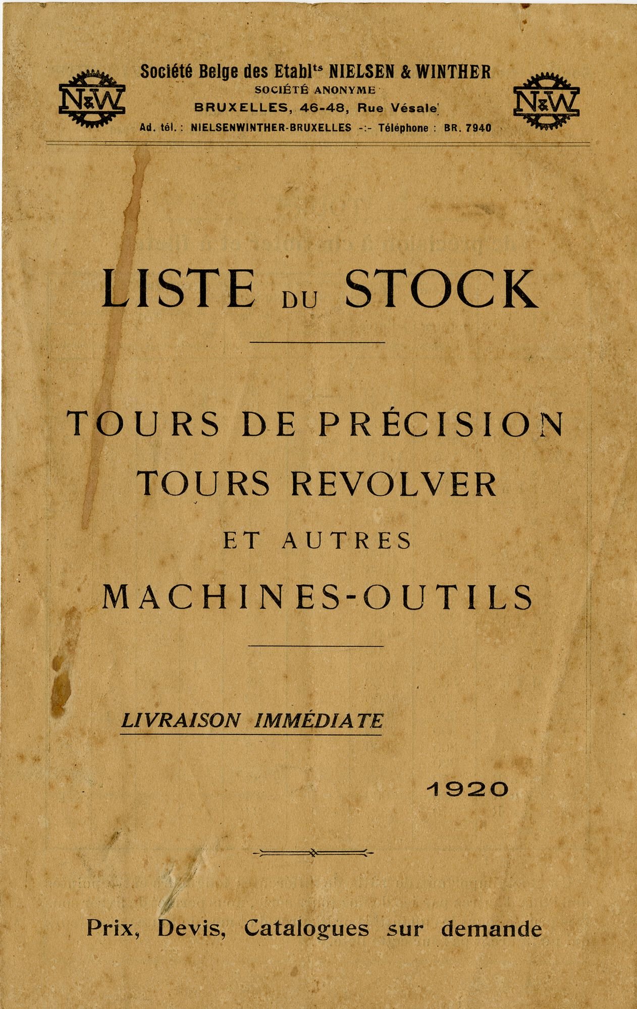 - opschriften: Société Belge des Etablts NIELSEN & WINTHER / SOCIÉTÉ ANONYME / BRUXELLES, 46-48, Rue Vésale / ... / LISTE DU STOCK / TOURS DE PRÉCISION / TOURS REVOLVER / ET AUTRES / MACHINES-OUTILS / LIVRAISON IMMÉDIATE / 1920 / Prix, Devis, Catalogues sur demande