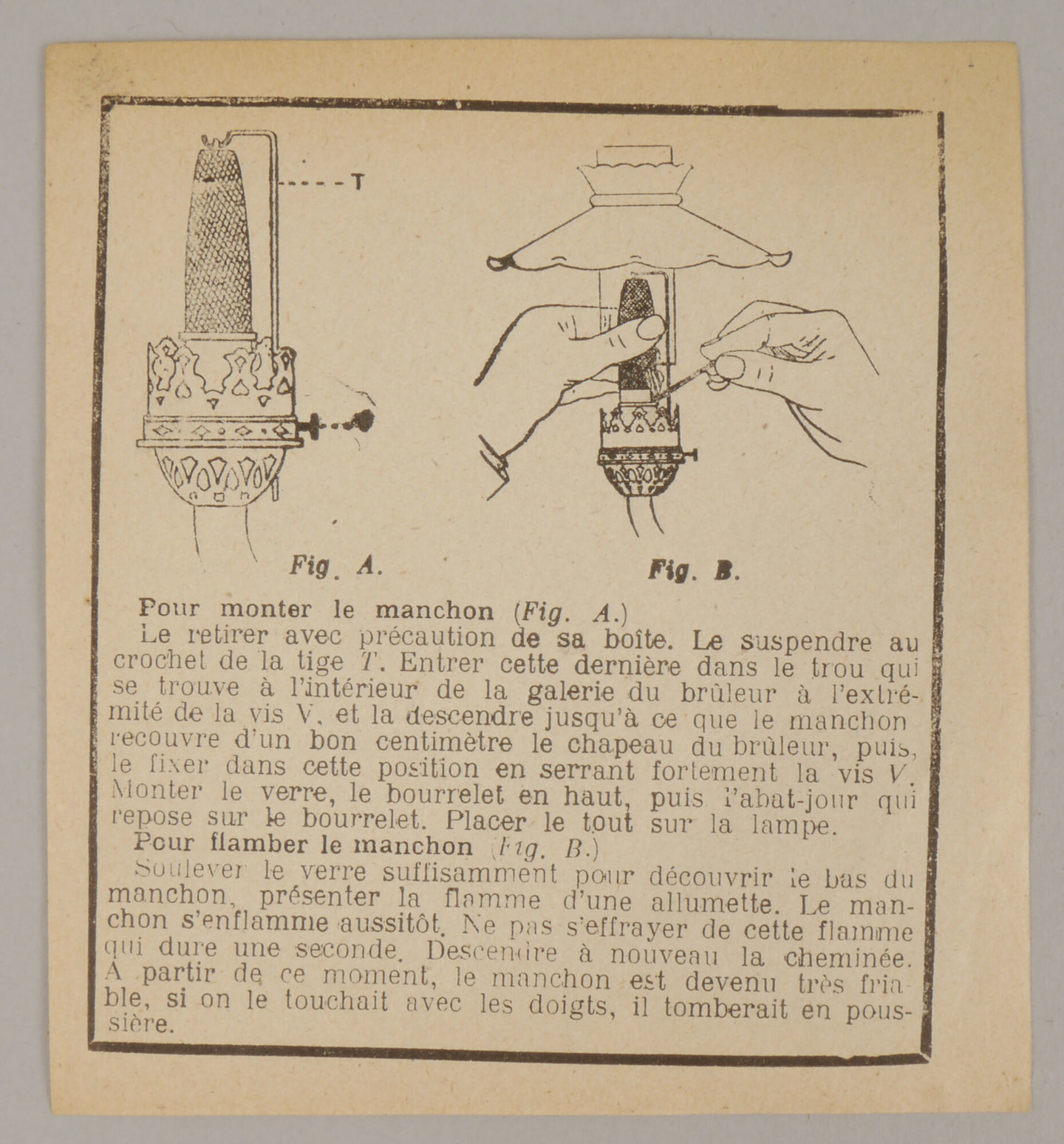 - opschriften: Pour monter le manchon (Fig. A.) / Le retirer avec précaution de sa boîte. Le suspendre au crochet de la tige T. Entrer cette dernière dans le trou qui se trouve à l'intérieur d ela galerie du brûleur à l'extrémité de la vis V. et la descendre jusqu'à ce