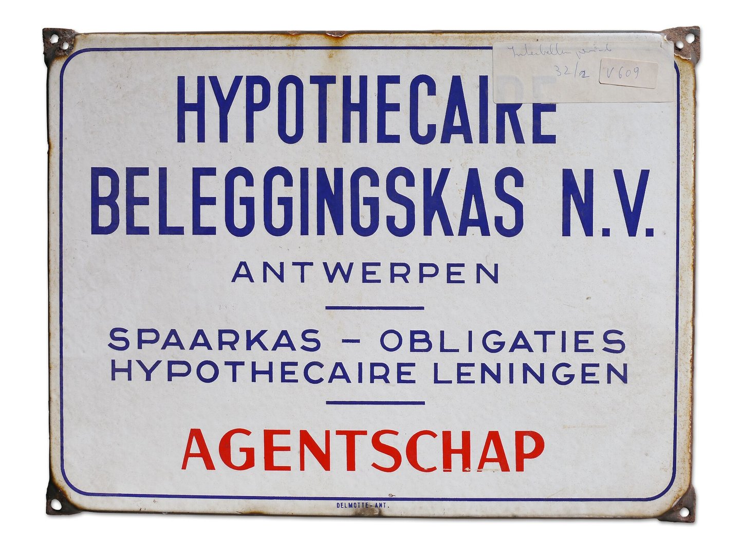 #metaal #email #2de kwart 20ste eeuw #publiciteit #informatie en communicatie #emailborden #uithangbord #Delmotte #Hypothecaire Beleggings- en Depositokas N.M.