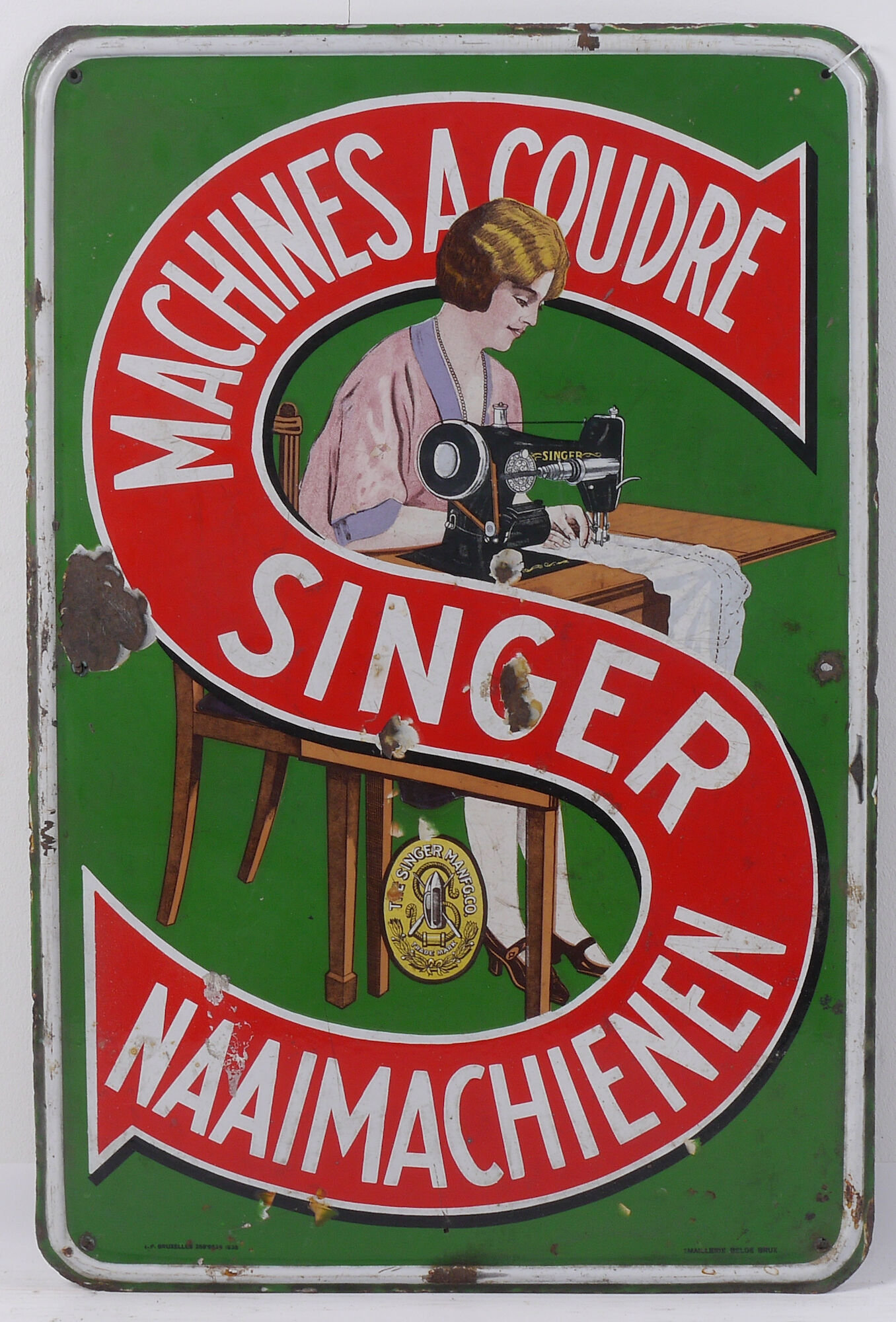 - opschriften: Machines a coudre / Singer / Naaimachienen // T.P. Bruxelles 359-663B-1938 / EMAILLERIE BELGE BRUX
