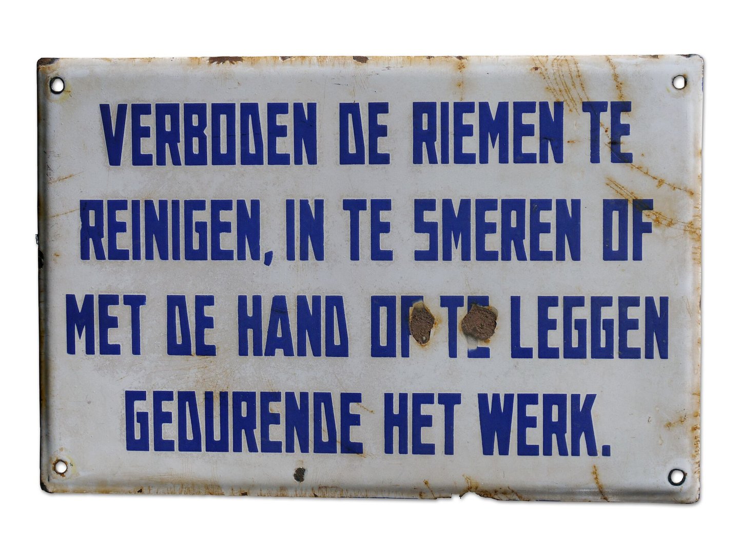 - opschriften: VERBODEN DE RIEMEN TE / REINIGEN, IN TE SMEREN OF / MET DE HAND OP TE LEGGEN / GEDURENDE HET WERK.