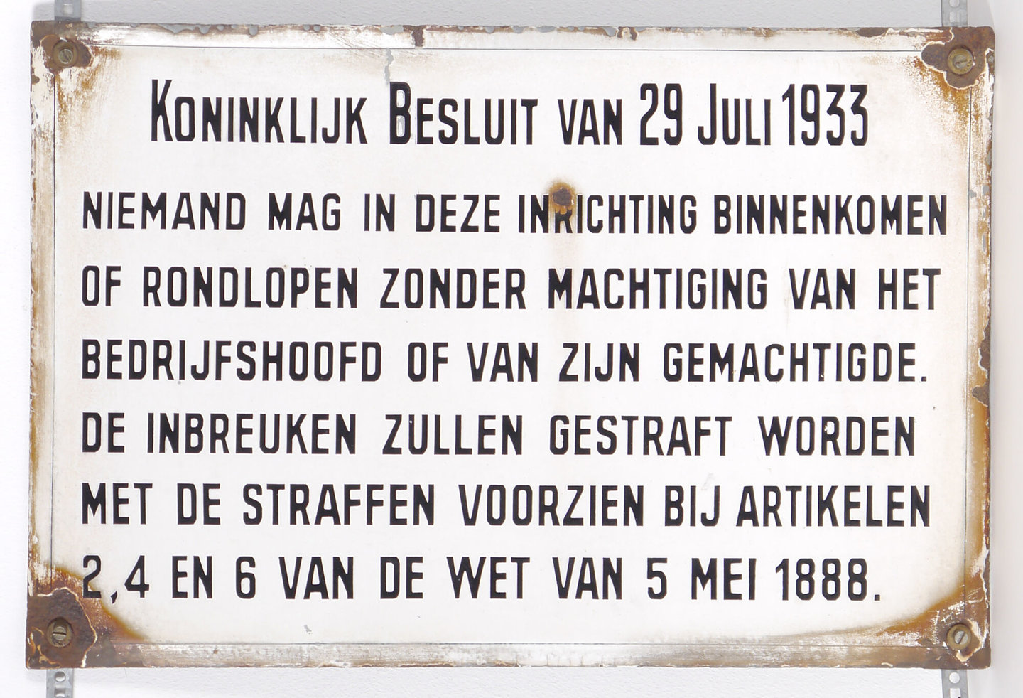 - opschriften: KONINKLIJK BESLUIT VAN 29 JULI 1933 / NIEMAND MAG IN DEZE INRICHTING BINNENKOMEN / OF RONDLOPEN ZONDER MACHTIGING VAN HET / BEDRIJFSHOOFD OF VAN ZIJN GEMACHTIGDE. / DE INBREUKEN ZULLEN GESTRAFT WORDEN / MET DE STRAFFEN VOORZIEN BIJ ARTIKELEN / 2, 4, EN 6