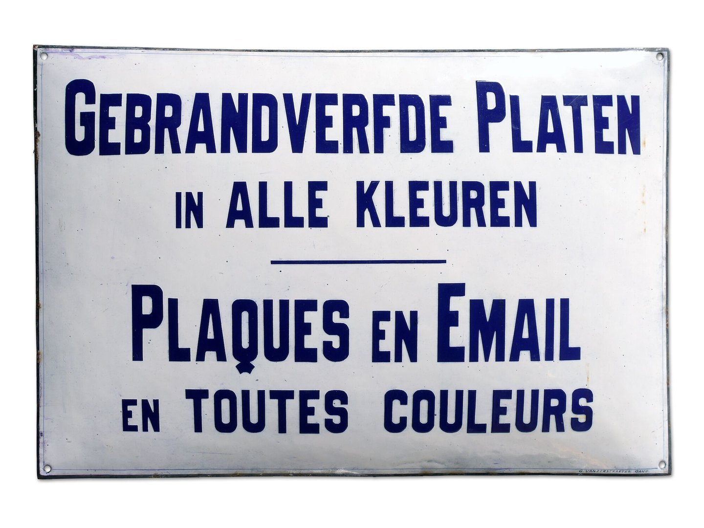 - opschriften: GEBRANDVERFDE PLATEN / IN ALLE KLEUREN / PLAQUES EN EMAIL / EN TOUTES COULEURS / G. VANDERSTRAETEN, GENT