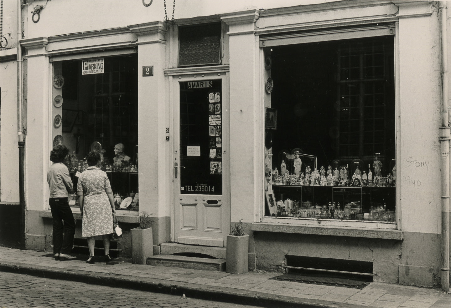 Parkeerproblemen zijn van alle tijden. Antiekwinkel Amaris in de Jan Breydelstraat met protestbord in de etalage: 'Waar blijft de parking voor onze klanten?'. Foto Gustaaf Van Damme, 1983, F10000-0042