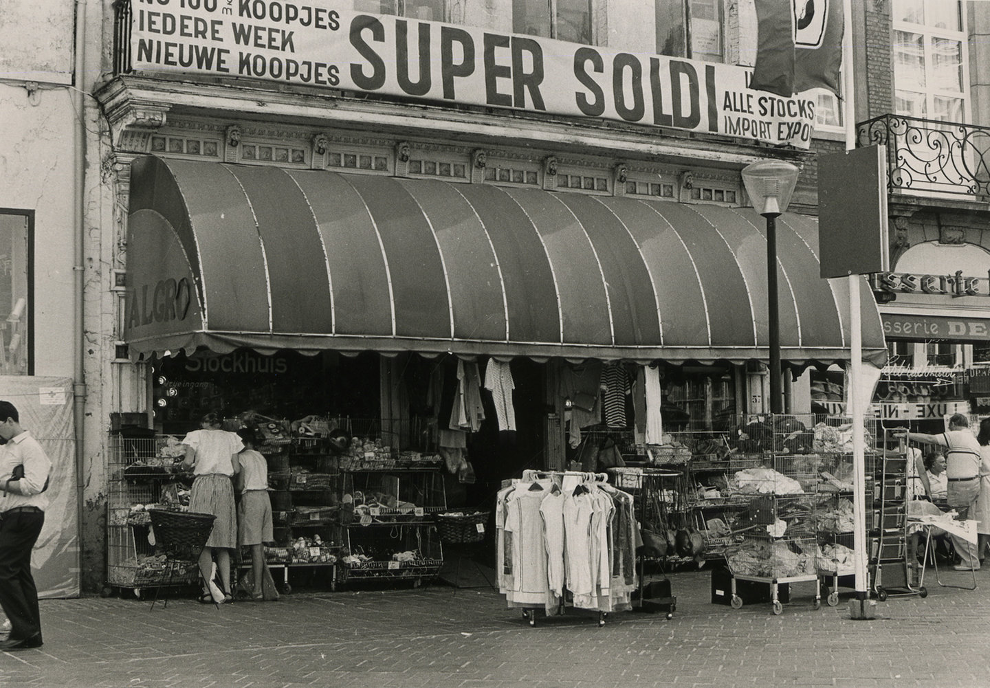 Foto van grootwarenhuis SARMA na de heropening in 1960. In het ontwerp van architect Gaston De Leye fungeert het terras als luifel voor de gelijkvloerse verdieping. Collectie Archief Gent, SCMS_FO_2973