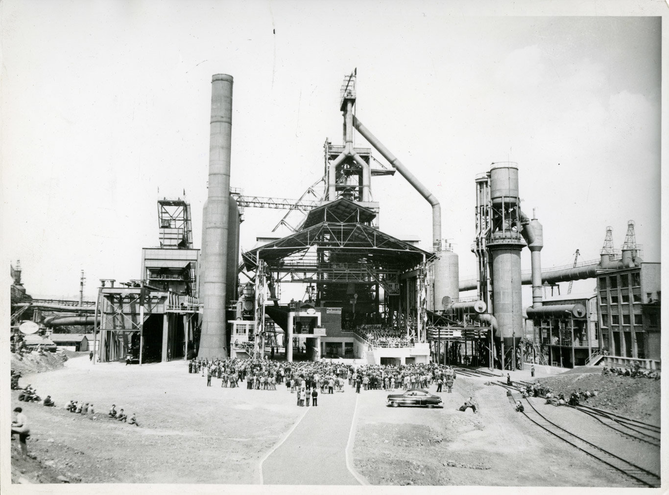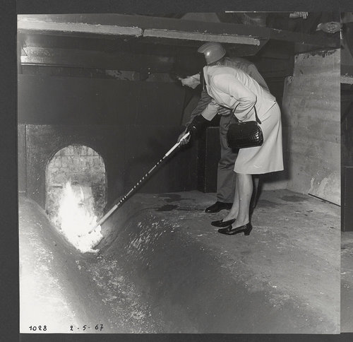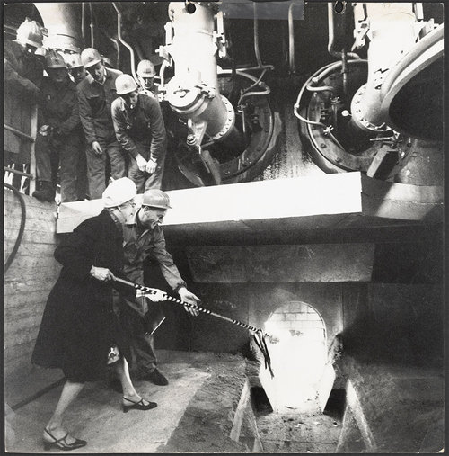 Mevrouw Hein, vrouw van directeur-generaal Joseph Hein, is meter van de eerste hoogoven van Sidmar. Zij mag het vuur ontsteken bij de inhuldiging op 2 mei 1967. Een jaar later is het de beurt aan mevrouw Nokin, vrouw van de eerste voorzitter van Sidmar, om de tweede hoogoven op te starten. Foto’s L. Morris, 1967-1968. Collectie ArcelorMittal Belgium