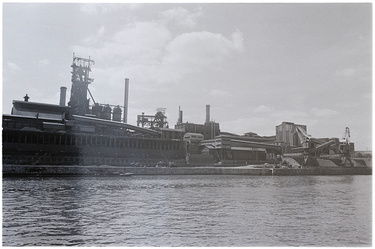 Zicht op staalfabriek Cockerill-Sambre in Seraing, de site waar John Cockerill in 1820 de eerste industriële hoogoven in België liet bouwen. Foto Patrick Viaene, 1986. Collectie Industriemuseum