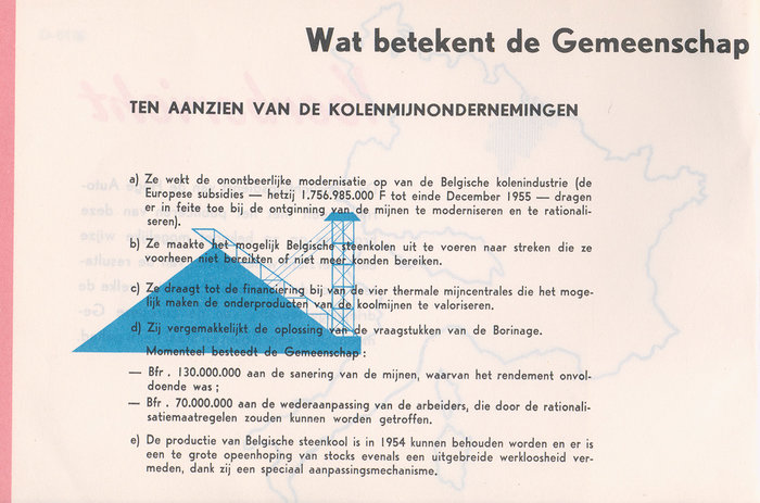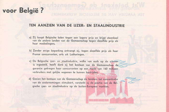 In 1951 stichten de Benelux-landen, Frankrijk, Duitsland en Italië de Europese Gemeenschap voor Kolen en Staal (EGKS) op. Via een gemeenschappelijke markt voor steenkool en staal wil de organisatie de economische groei bevorderen. Dit toont het belang aan van staal in de wereldeconomie. Brochure uit 1956 over de betekenis van de EGKS voor de Belgische staalindustrie. Collectie Liberas