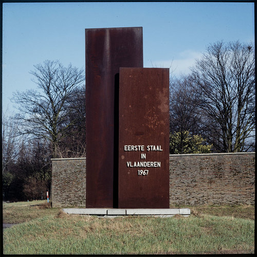 Aan het begin van de Gentse J.F. Kennedylaan merk je ze zeker op: twee rechtopstaande plakken staal. Het monument van de hand van beeldhouwer Luc Goossens onderstreept de symbolische waarde van het eerste staal gegoten in Vlaanderen in 1967. Foto J. Van den Berghe, ca. 1990. Collectie ArcelorMittal Belgium