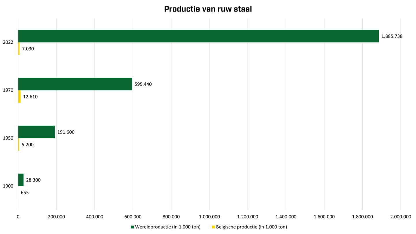 Verhouding tussen de wereldproductie en de Belgische productie van ruw staal doorheen de tijd. Bronnen: World Steel Association; Statista.com; International Iron and Steel Institute, A handbook of world steel statistics 1978.