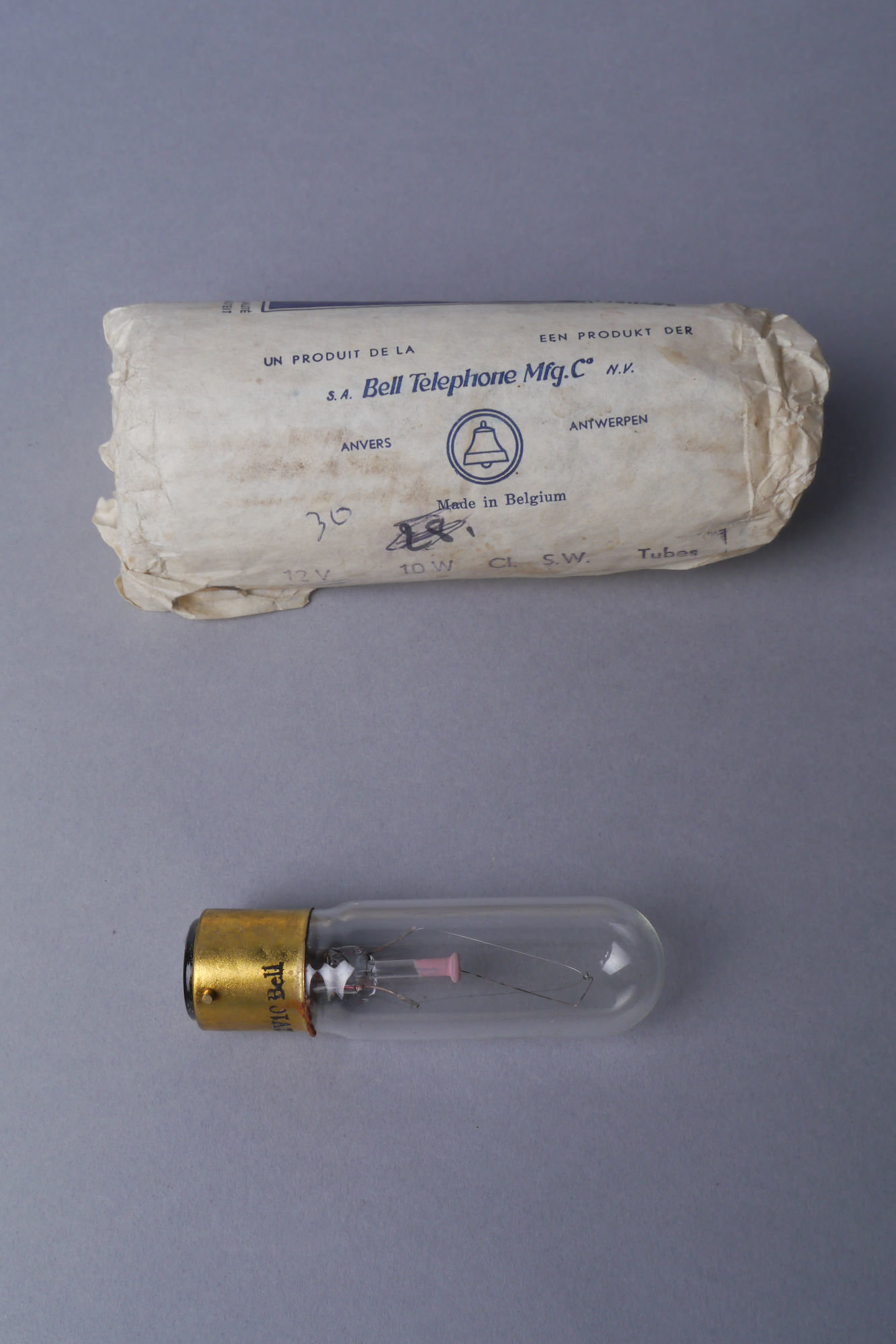 - opschriften: EEN PRODUKT DER Bell Telephone Mfg. C° NV / ANTWERPEN / Made in Belgium // 12 V 10 W Cl. S.W. Tubes