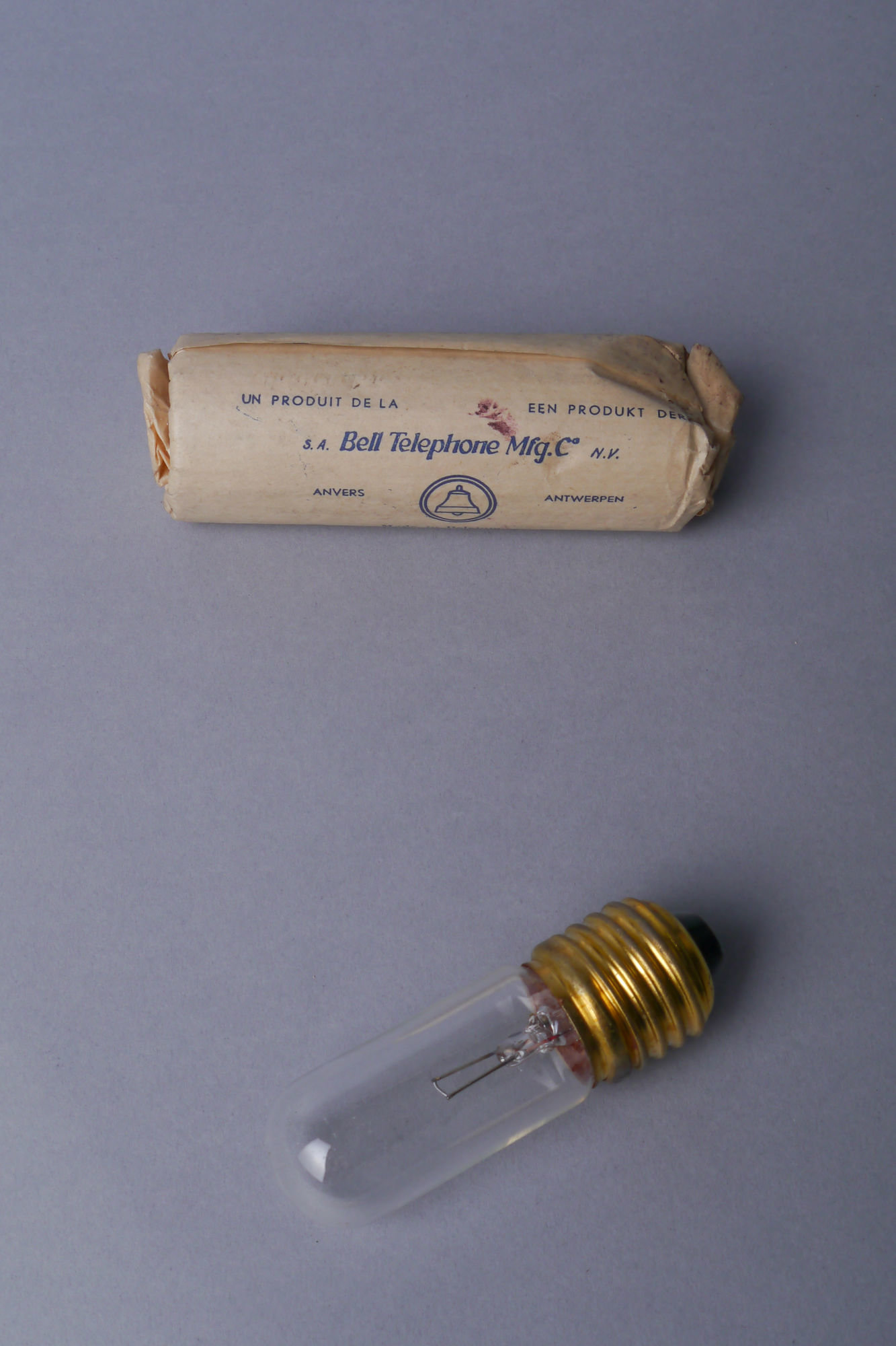 - opschriften: EEN PRODUKT DER Bell Telephone Mfg. C° NV / ANTWERPEN // 12 V 5 W Cl E
