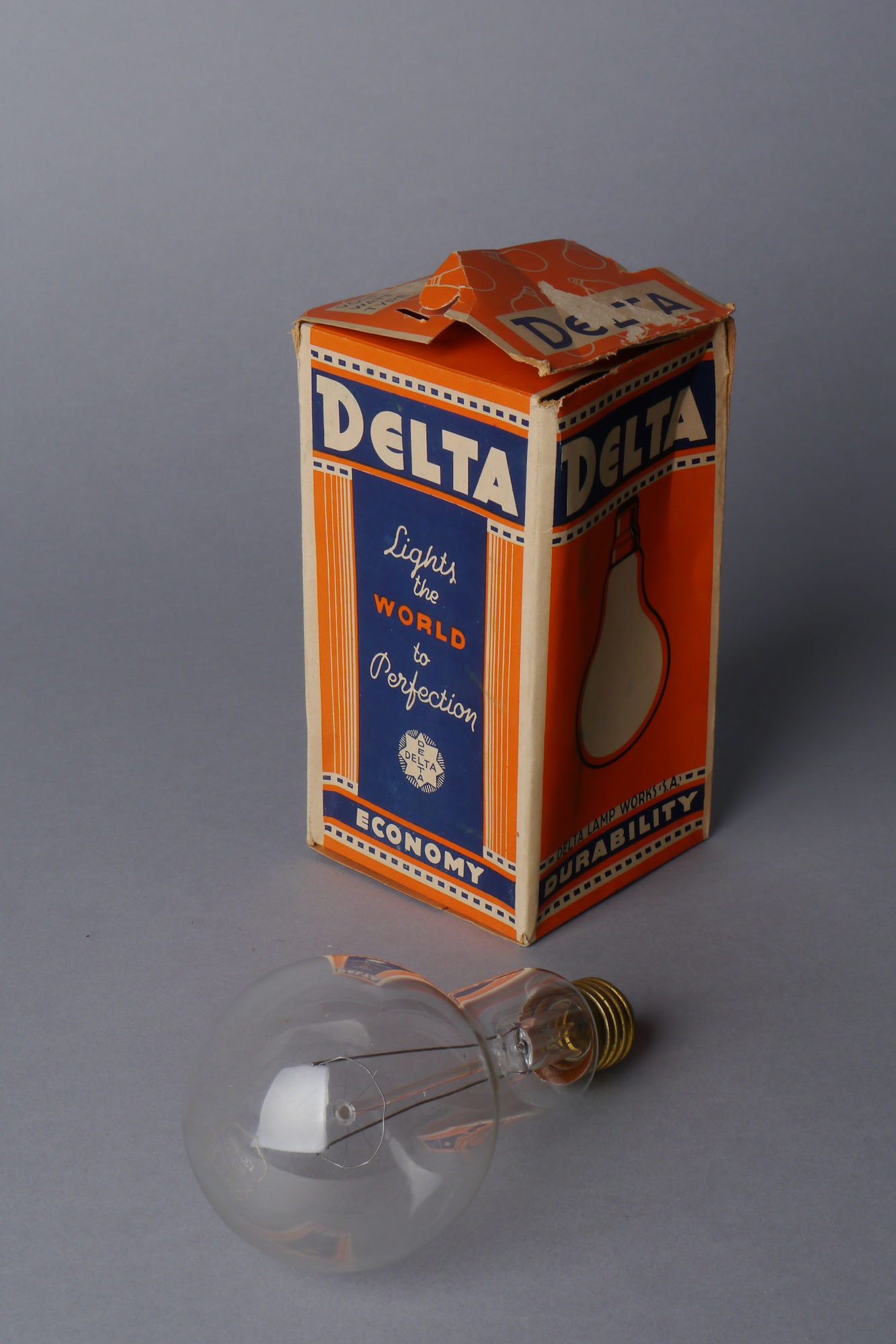 - opschriften: DELTA / DELTA LAMP WORKS S.A. / DURABILITY / DELTA Lights / the / WORLD / to Perfection / ECONOMY / DELTA / This lamp is / guaranteed to / burn 1000 hours / by Faraday's / official test manufactured by: / The DELTA / LAMP WORKS S.A. / PERFECTION