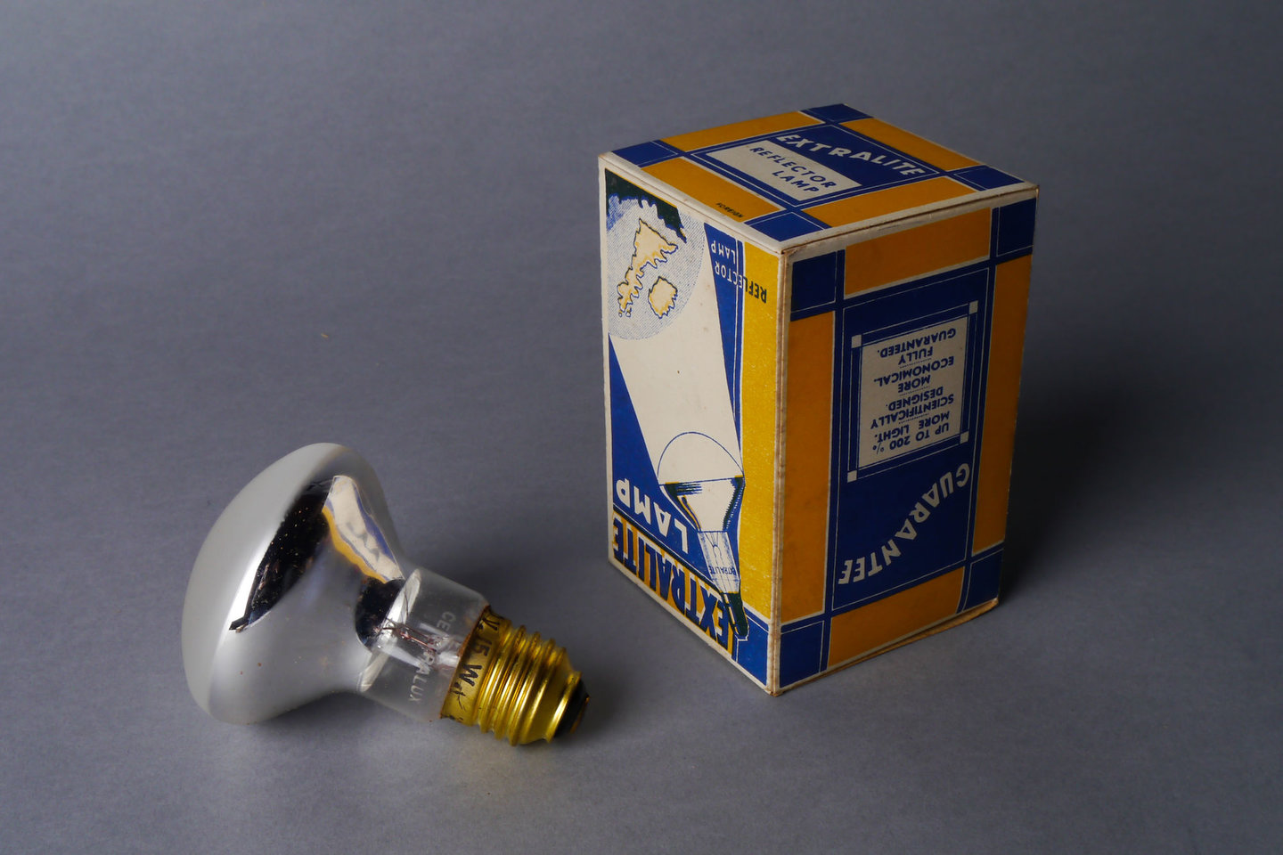 - opschriften: EXTRALITE / LAMP / REFLECTOR / LAMP // GUARANTEE / THIS LAMP IS / MADE TO BRITISH ENGINEERINGS / STANDARDS / FREE REPLACEMENT / GUARANTEED / IF FAILING PREMATURELY / GUARANTEE / UP TO 200% / MORE LIGHT. / SCIENTIFICALLY / DESIGNED / MORE / ECONOMICAL. / F