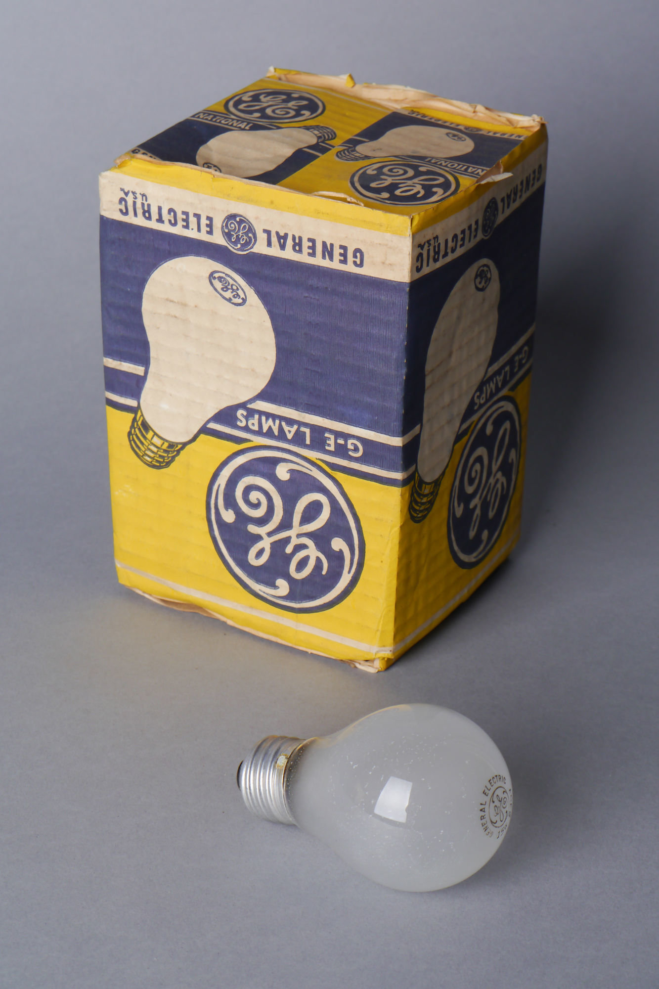 - opschriften: G-E LAMPS code-15A / INSIDE FROSTED / 15W A17/ 230 Volt / GENERAL ELECTRIC COMPANY / NELA PARK CLEVELAND 12, OHIO // THOMAS A. EDISON / INVENTOR OF THE / FIRST PRACTICAL / INCANDESCENT / LAMP 1879 / The constant aim of G-E Lamp Research / is to make G-E L
