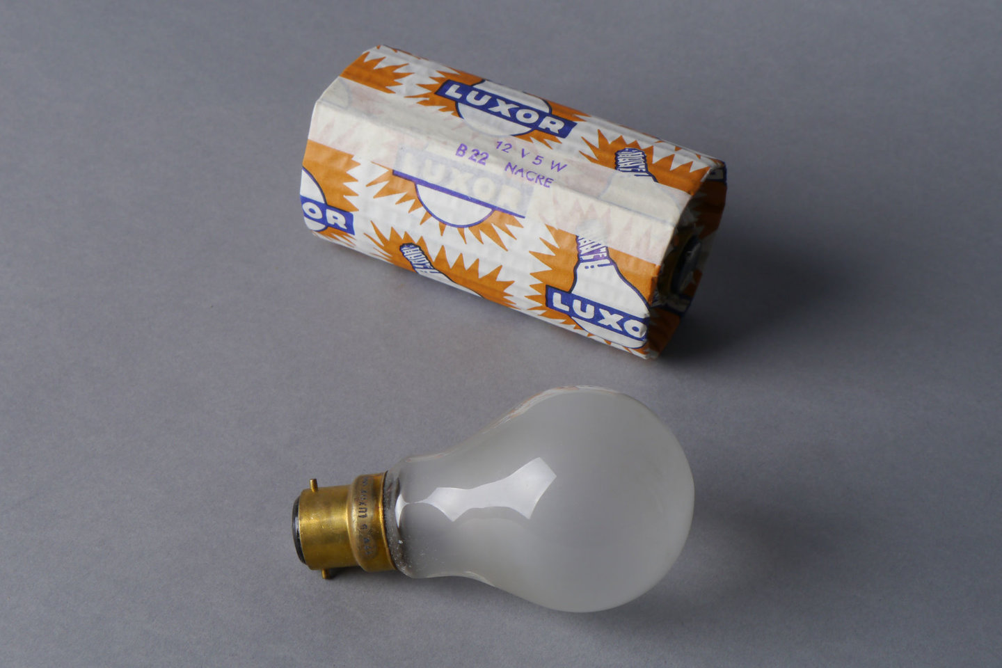 - opschriften: 12 V 5 W / B 22 NACRE