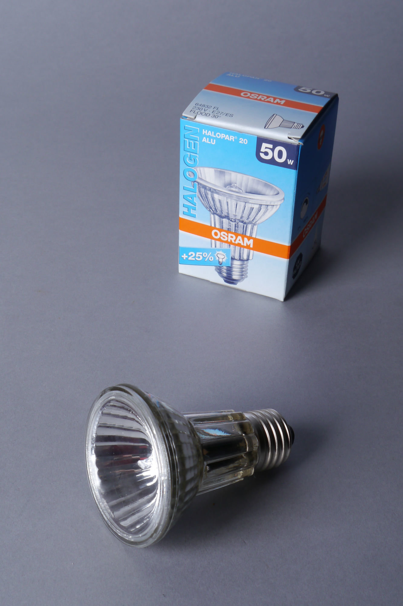 - opschriften: HALOPAR 20 50W / ALU / OSRAM / 64832 FL / 230V . E27/ES / FLOOD 30°