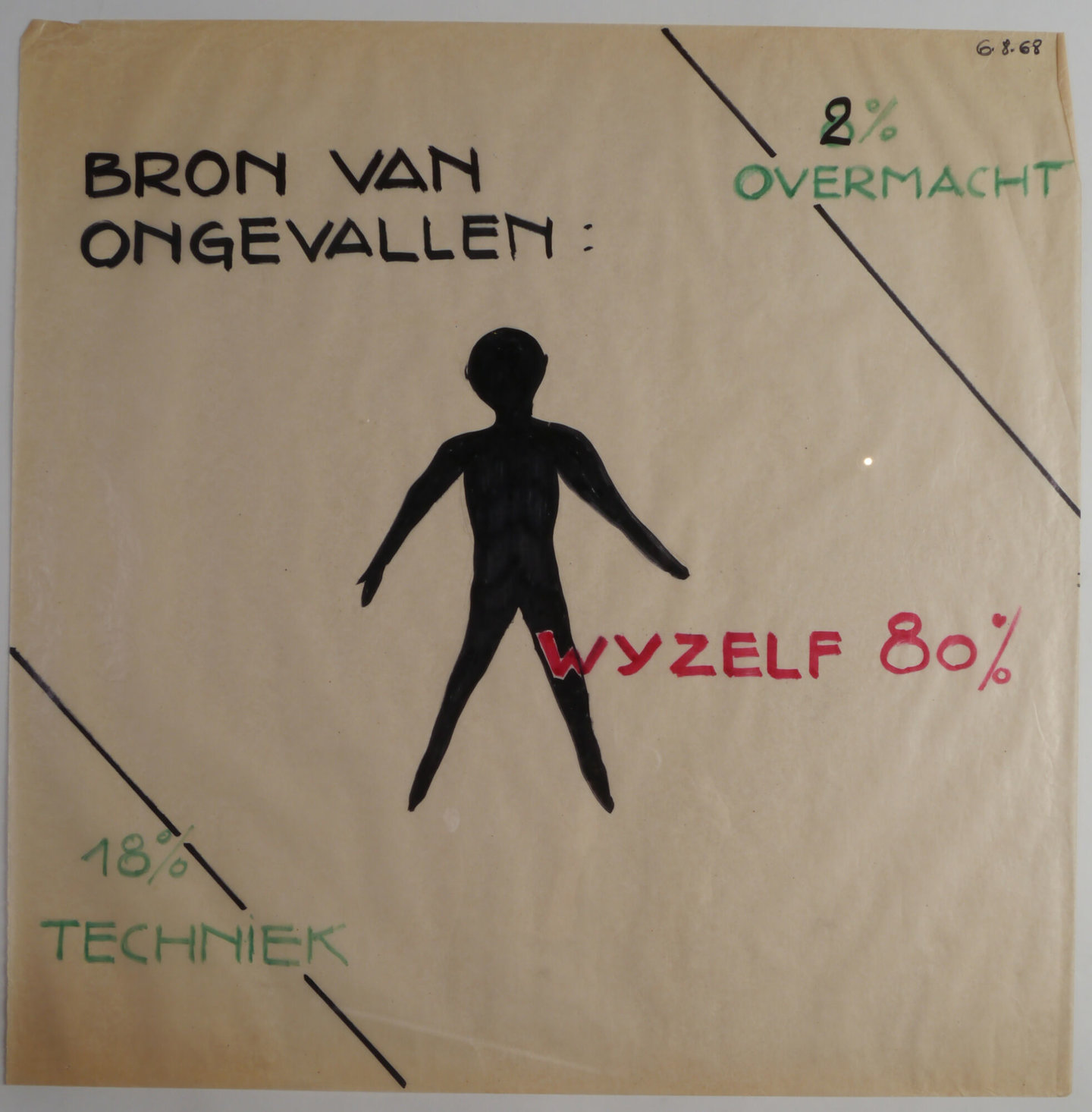 - opschriften: 6/8/68 Bron van ongevallen: / 2% overmacht / wyzelf 80% / 18% techniek