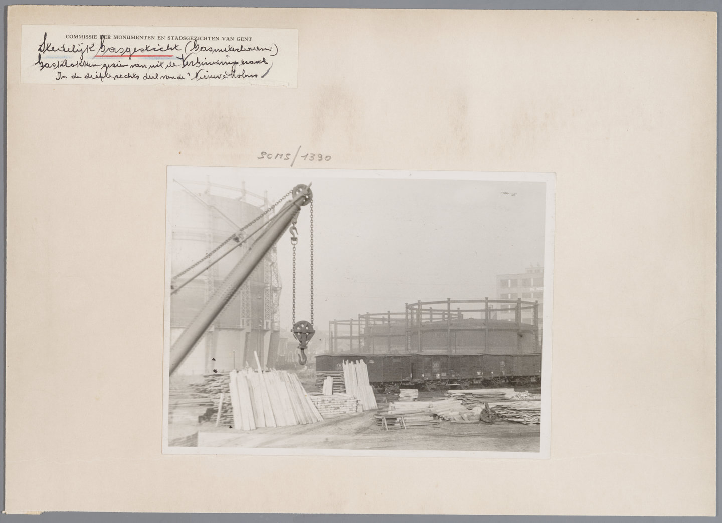 Zicht op vier gashouders van de gasfabriek, circa 1940. Collectie Archief Gent, MA_SCMS_FO_01390.