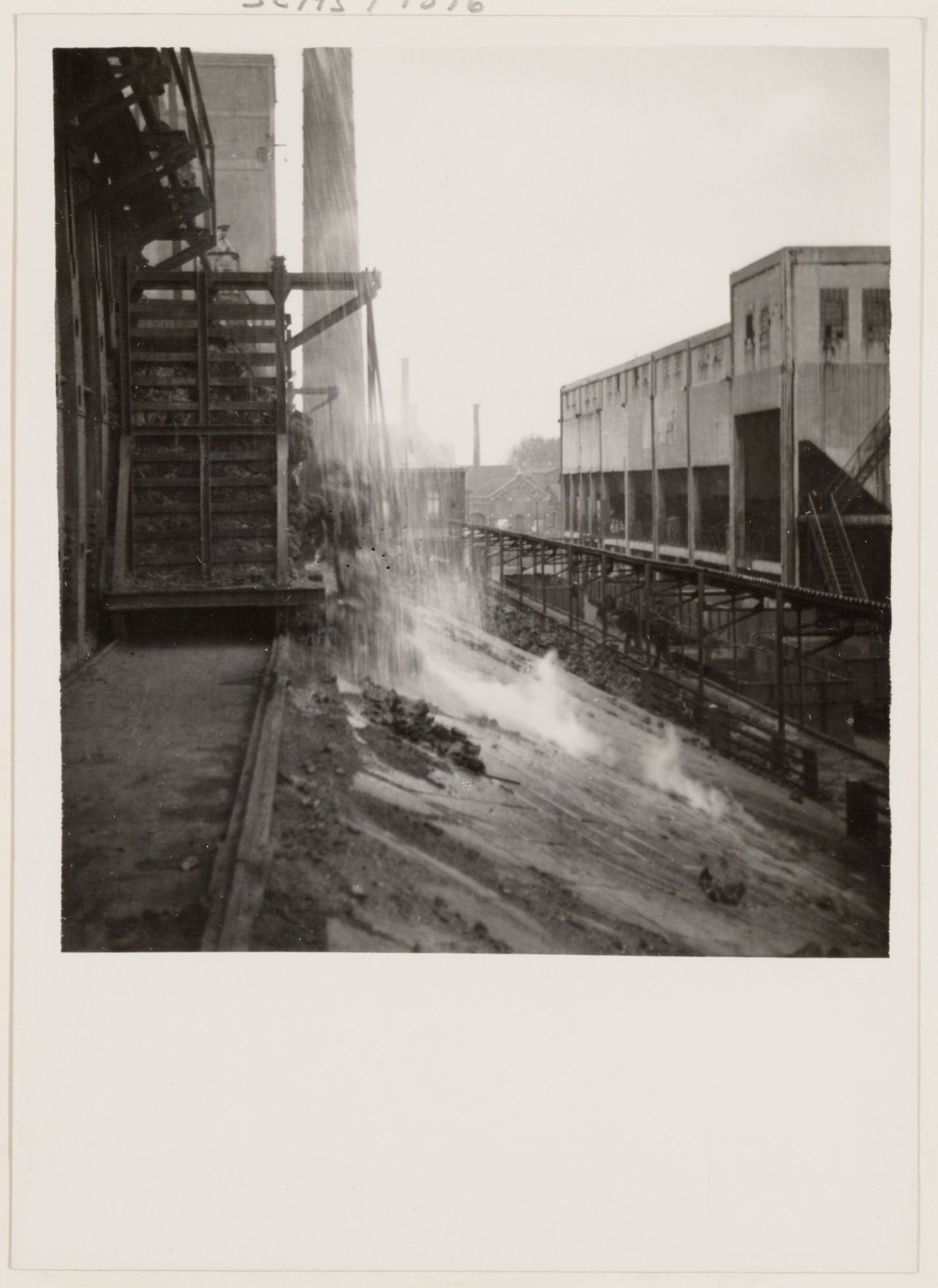 Op de Gasfabriek aan de Gasmeterlaan: gloeiend hete cokes worden uit de kamerovens gelost en met water besproeid om af te koelen. Rechts zicht op de cokessilo. Foto, 1937. Collectie Archief Gent, MA_SCMS_FO_01396.