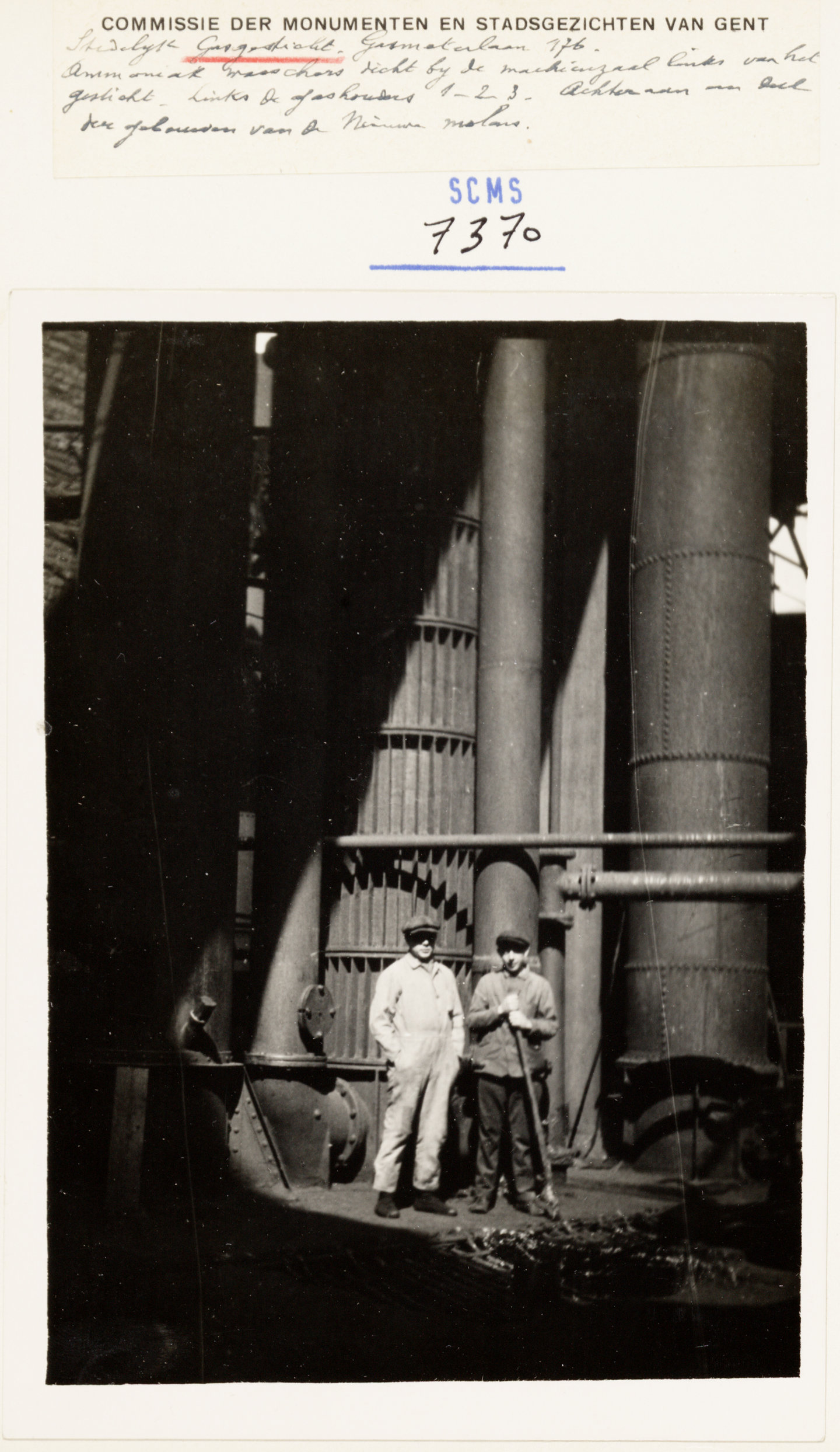 Twee arbeiders bij de wassers van de gasfabriek aan de Gasmeterlaan, circa 1940. Collectie Archief Gent, MA_SCMS_FO_07370.