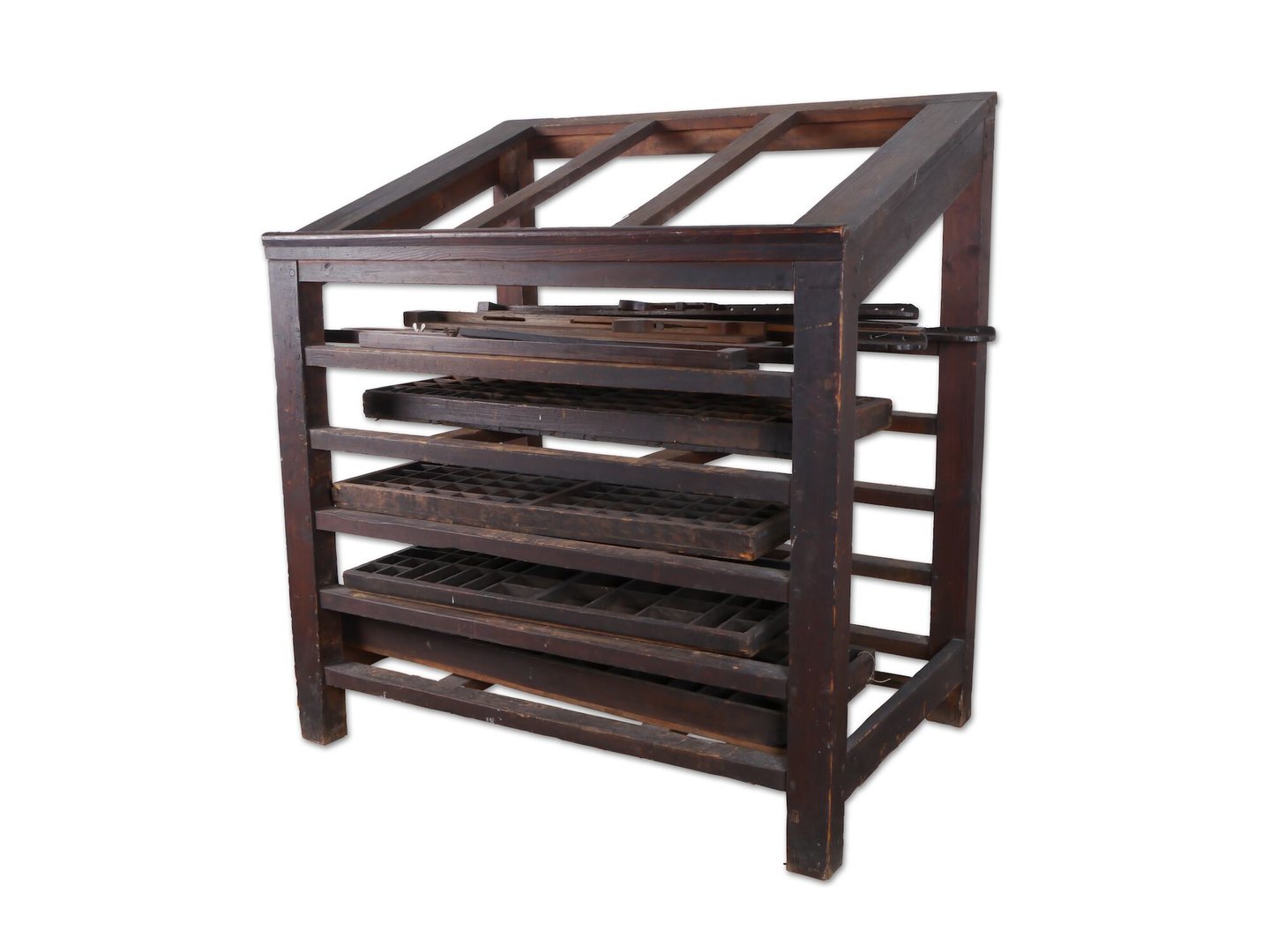 #hout #zetterij #hoogdruk #drukkerij #letterkast #meubilair #zetbok #begin 19de eeuw #Vander Haeghen Drukkerij
