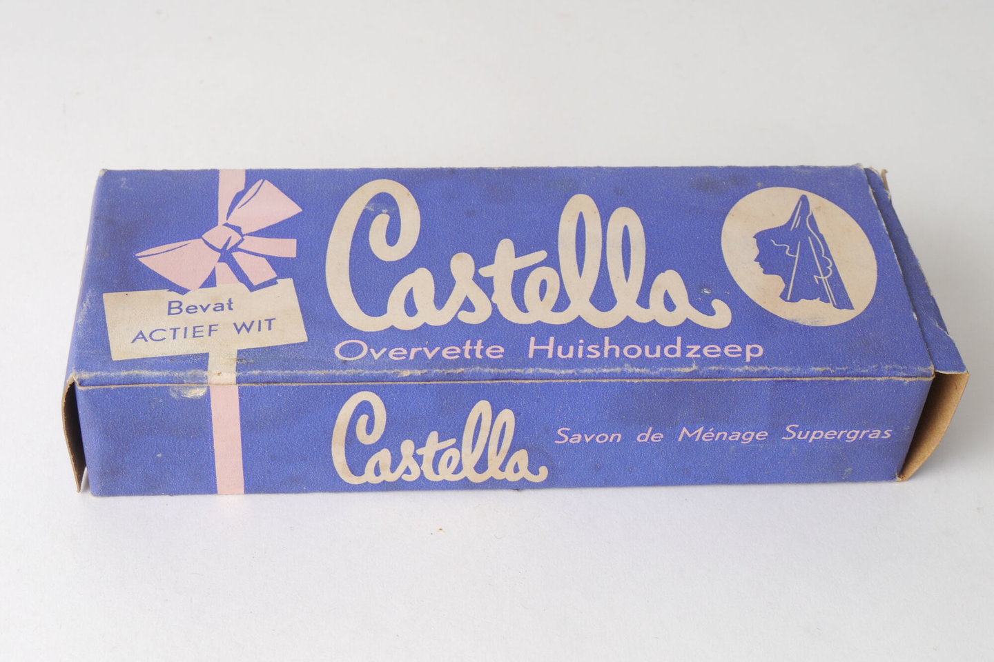 - opschriften: Castella / Overvette Huishoudzeep / Bevat / ACTIEF WIT // 140 gr A.G. / Castella / Huishoudzeep is / OVERVET