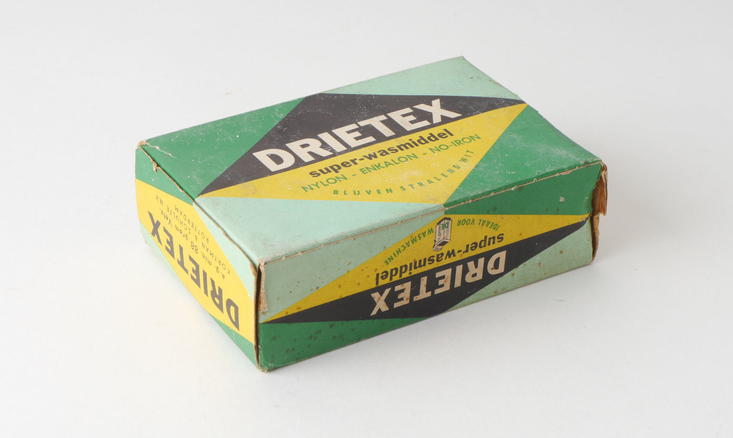 - opschriften: DRIETEX / super-wasmiddel / NYLON - ENKALON - NO-IRON / BLIJVEN STRALEND WIT // DRIETEX / super-wasmiddel / IDEAAL VOOR DE WASMACHINE // DRIETEX / VOOR 30 LITER / SOP / DRIETEX / a.g. min. 88 gram Vetz. / KORTMAN SCHULTE N.V. / ROTTERDAM