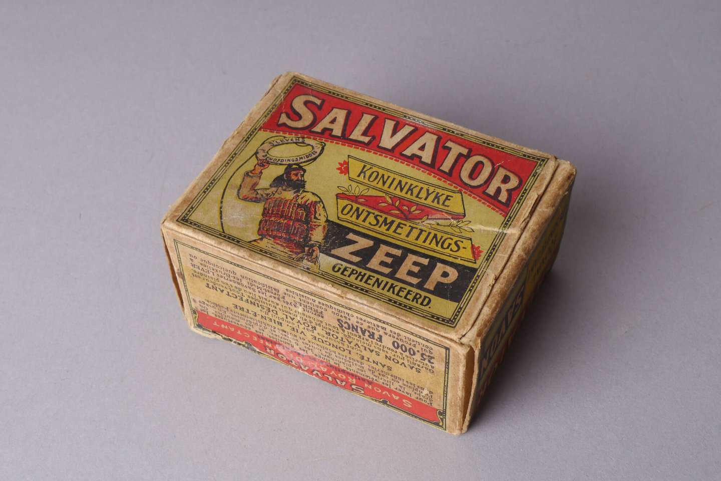 - opschriften: SALVATOR / KONINKLIJKE / ONTSMETTINGSZEEP / GEPHENIKEERD // SALVATOR / KONIKLIJKE ONTSMETTINGSZEEP / Antiseptisch ontbinding vermijdend en ontsmettend / Om Kleederen, linnengoed, flanel, dekens, lakens, beddegoed, planken, / vloeren / houtwerk, en meubele