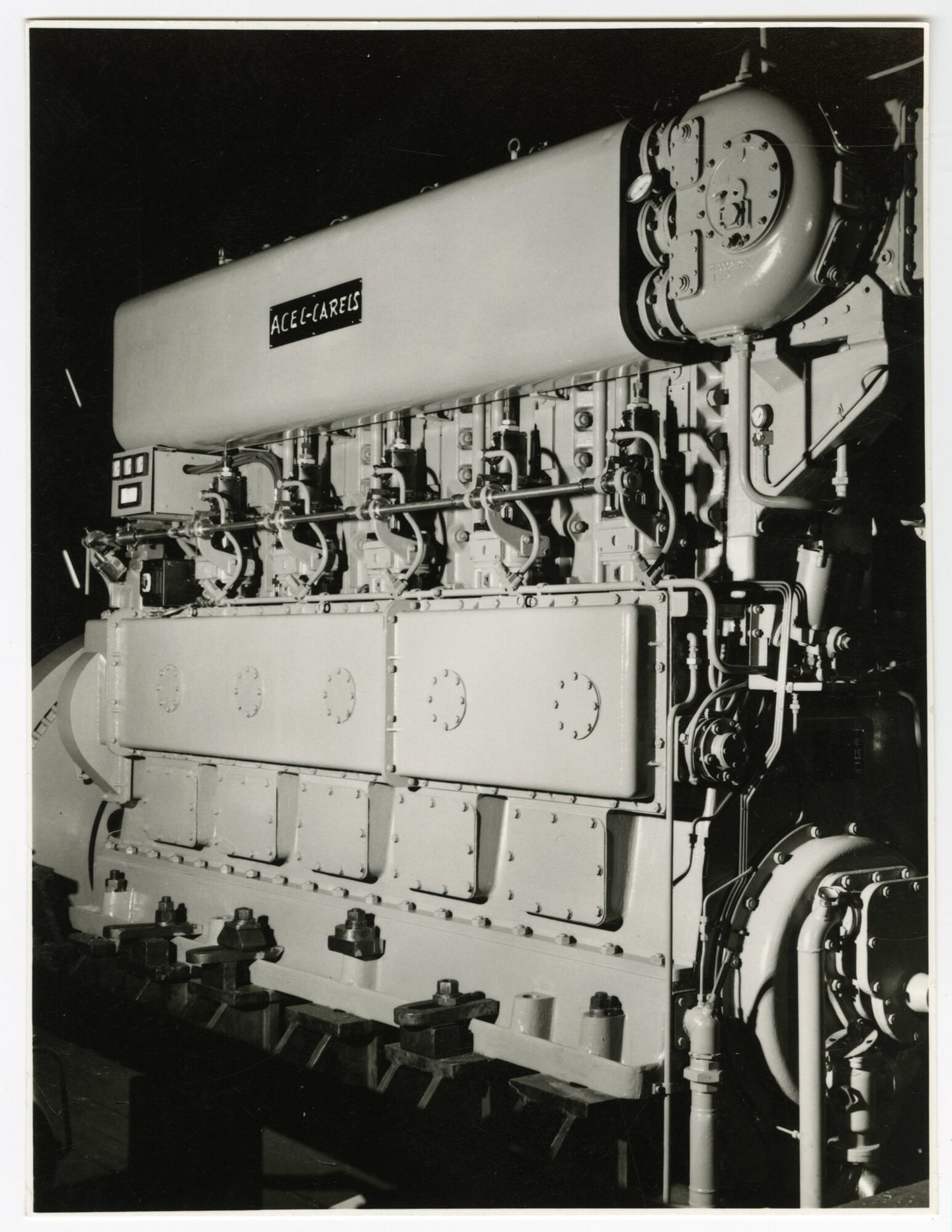 - opschriften: Moteur ACEC-CARELS, 4 temps type E 35 S de 1520 CV à 375 tr/min, destiné à un groupe électrogène pout REGIDESO - R.D.C. - en cours d' installation dans la Centrale de MBANDAKA. 5 groupes identiques seront intsallès dans differèntes centrales de REGIDESO -