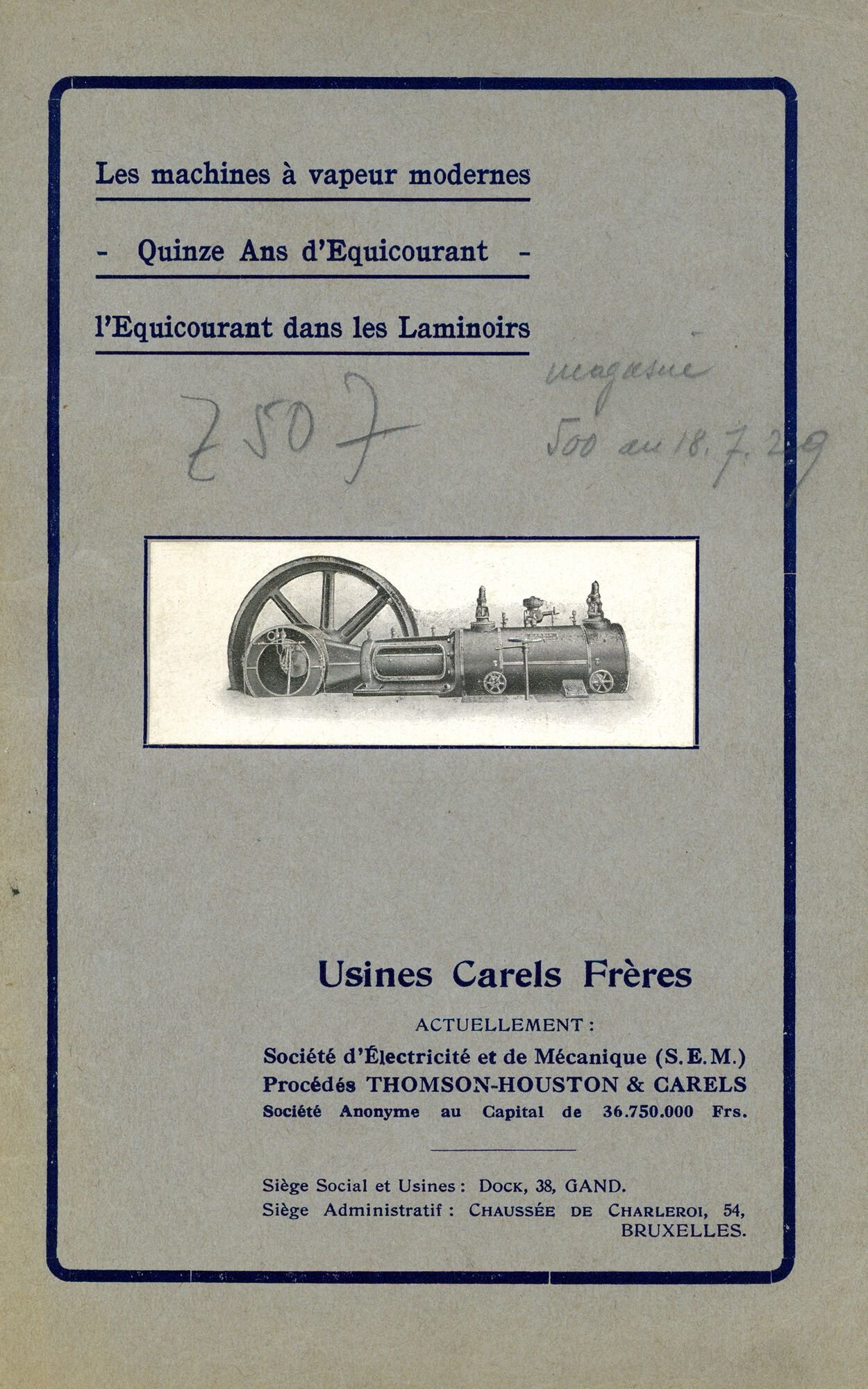 - opschriften: Les machines à vapeur modernes - Quinze And d'Equicourant - l'Equicourant dans les Laminoirs / Usines Carels Frères / ACTUELLEMENT: / Société d'Électricité et de Mécanique (S.E.M.) / Procédés THOMSON-HOUSTON & CARELS / Société Anonyme au Capital de 36.750