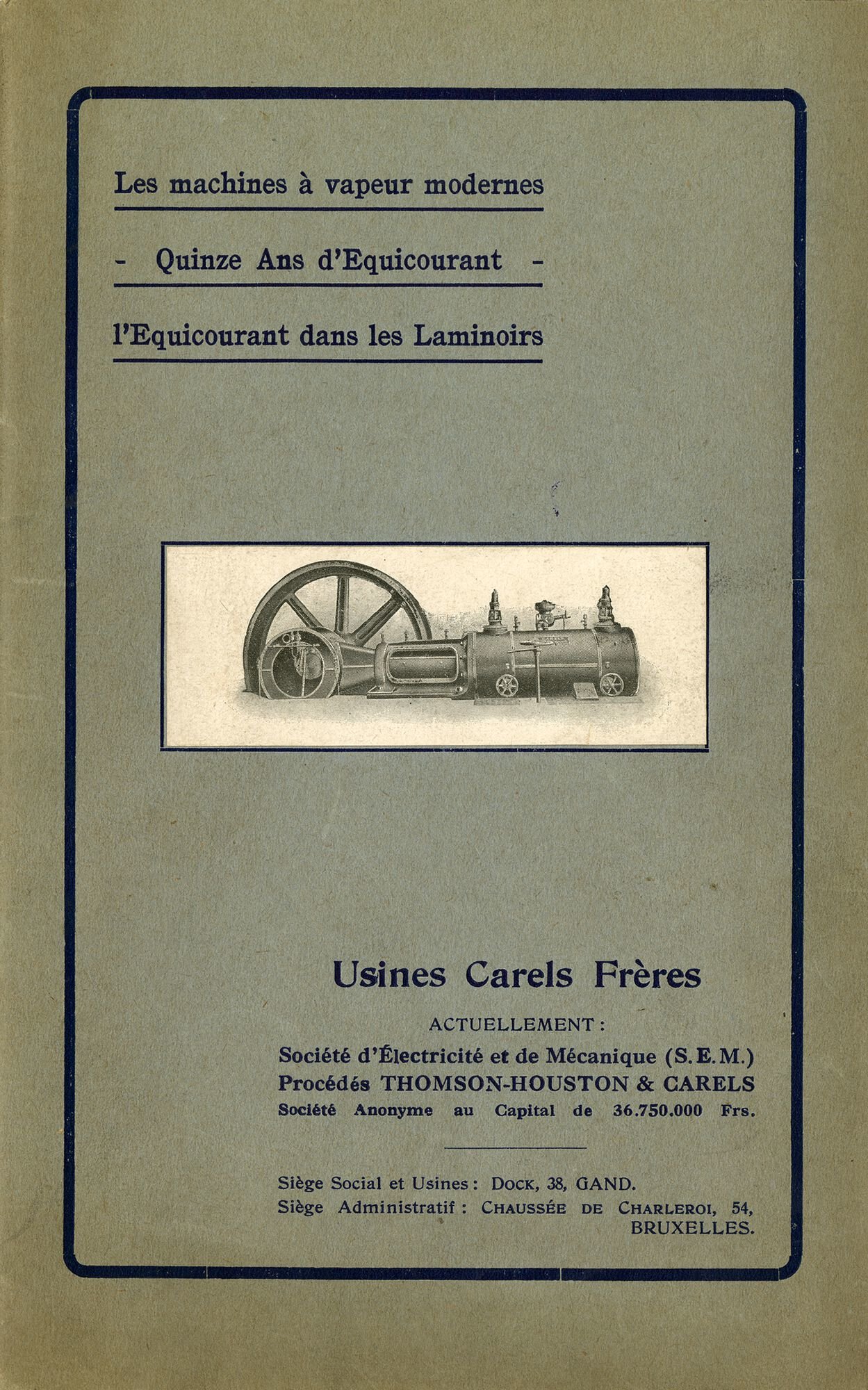 - opschriften: Les machines à vapeur modernes - Quinze And d'Equicourant - l'Equicourant dans les Laminoirs / Usines Carels Frères / ACTUELLEMENT: / Société d'Électricité et de Mécanique (S.E.M.) / Procédés THOMSON-HOUSTON & CARELS / Société Anonyme au Capital de 36.750