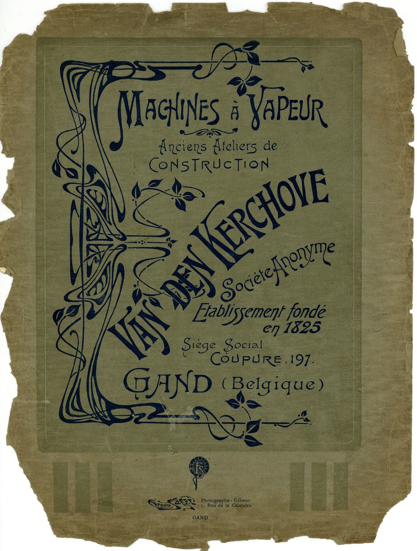 - opschriften: Anciens Ateliers de Construction / VAN DEN KERCHOVE / Société Anonyme / Établissement fondé en 1825 / SiÈGE SOCIAL: / Coupure, 197, GAND / BELGIQUE / MACHINES A VAPEUR