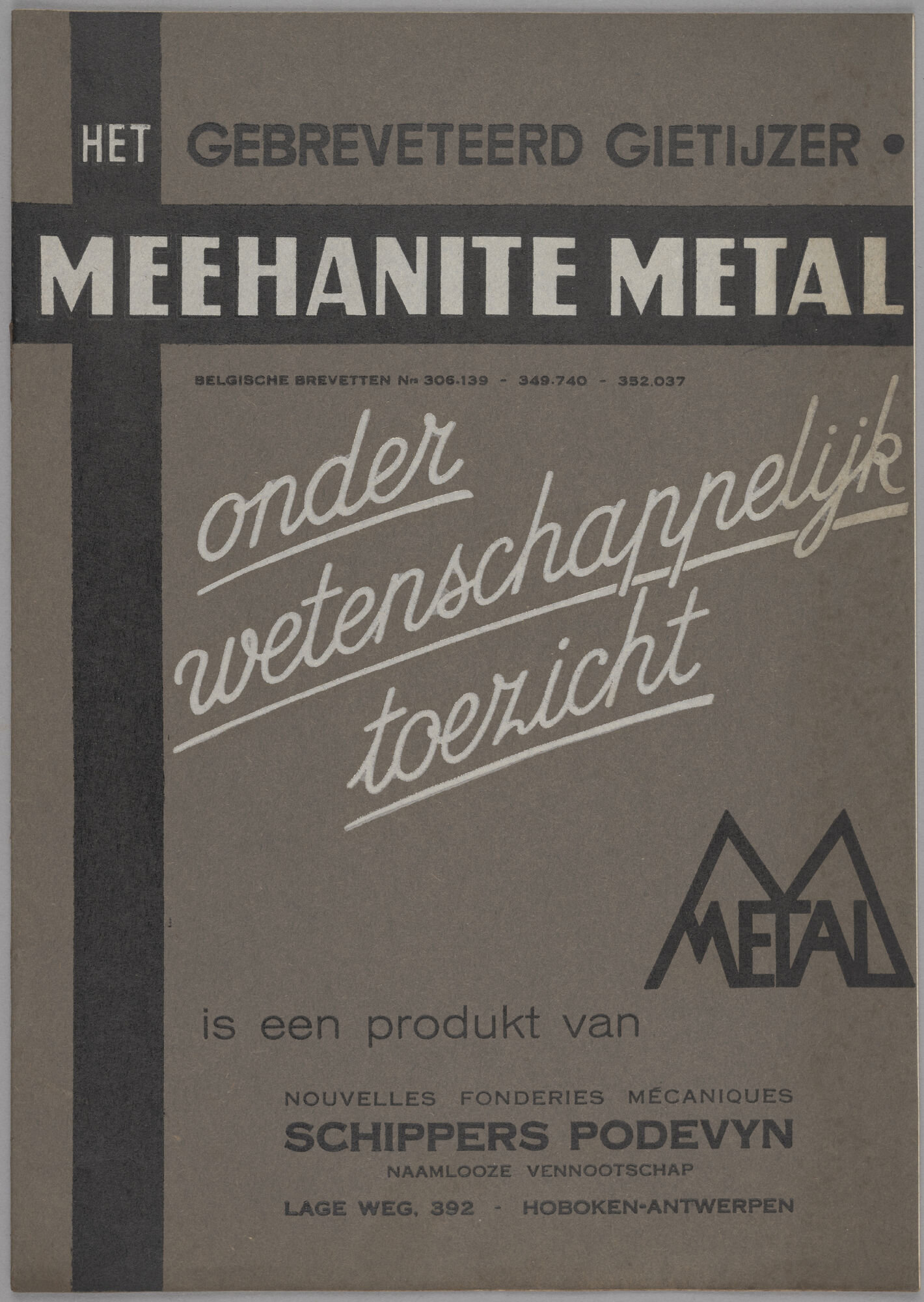 - opschriften: het gebreveteerd gietijzer / Meehanite Metal / Belgische brevetten Nrs 306.139 - 349.740 - 352.037 / onder wetenschappelijk toezicht / METAL / is een produkt van / Nouvelles fonderies Mécanique / Schippers Podevyn / naamloze vennootschap / Lage weg, 392 H