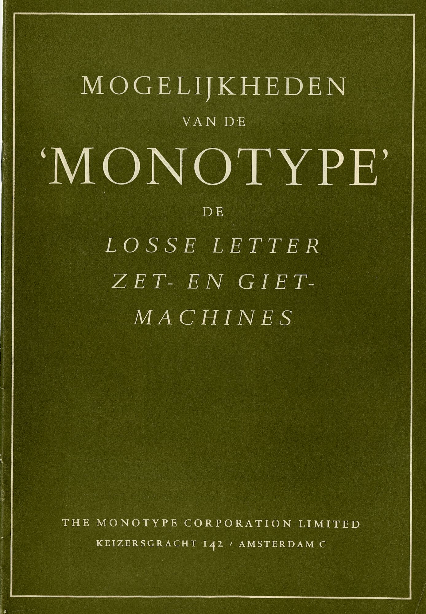 - opschriften: MOGELIJKHEDEN VAN DE 'MONOTYPE' DE LOSSE LETTER ZET- EN GIETMACHINES / THE MONOTYPE CORPORATION LIMITED KEIZERSGRACHT 142, AMSTERDAM C