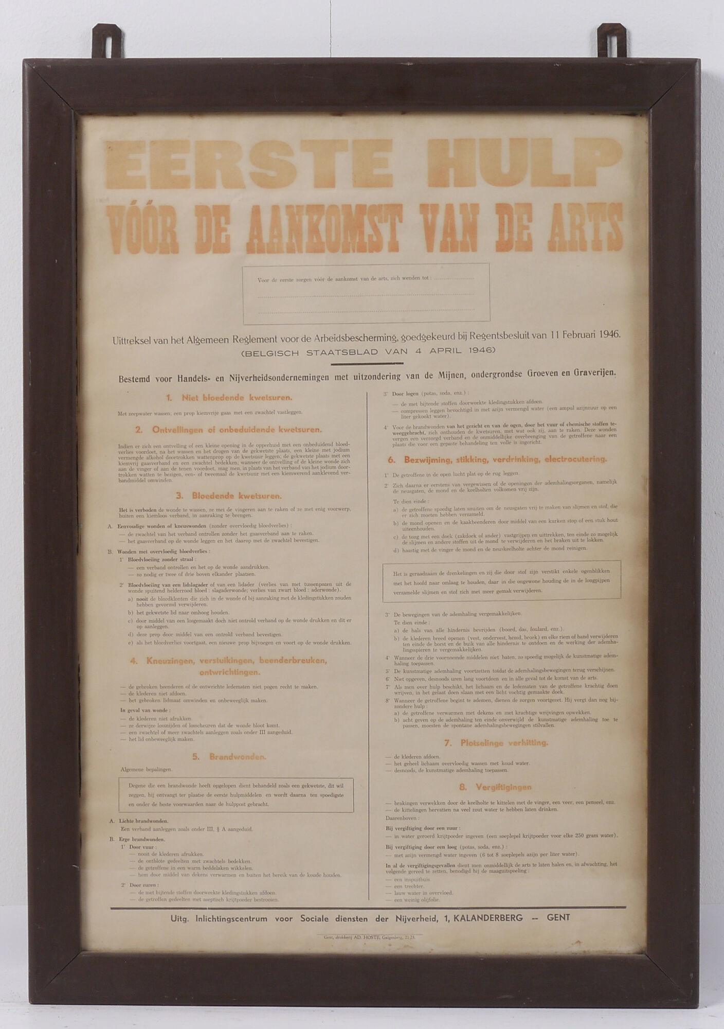 - opschriften: EERSTE HULP / VÓÓR DE AANKOMST VAN DE ARTS / ...