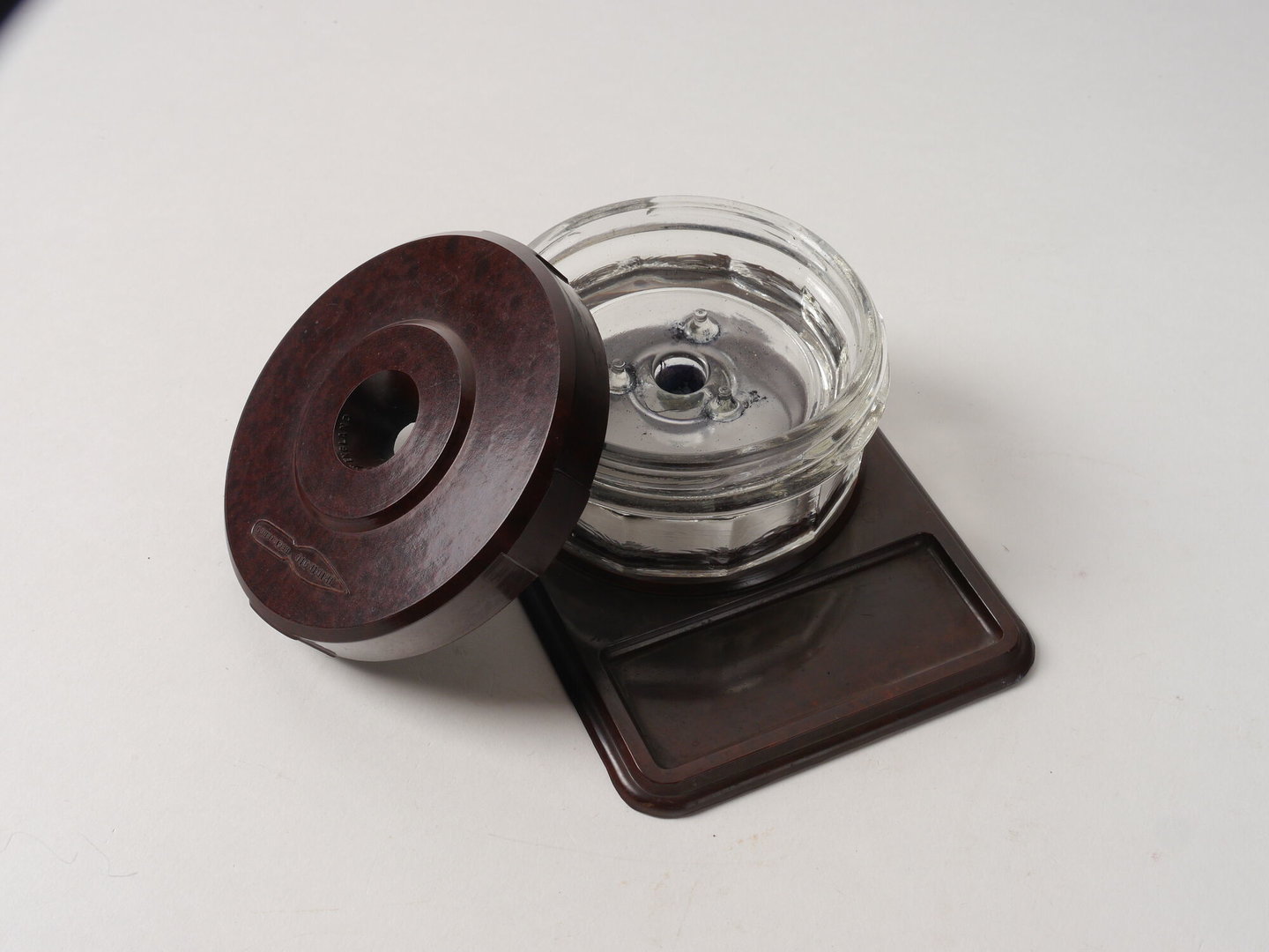 #glas #bakeliet #2de kwart 20ste eeuw #informatie en communicatie #kantoor #inktpot #schrijfgerei #Perry E.S. #Iridinoid