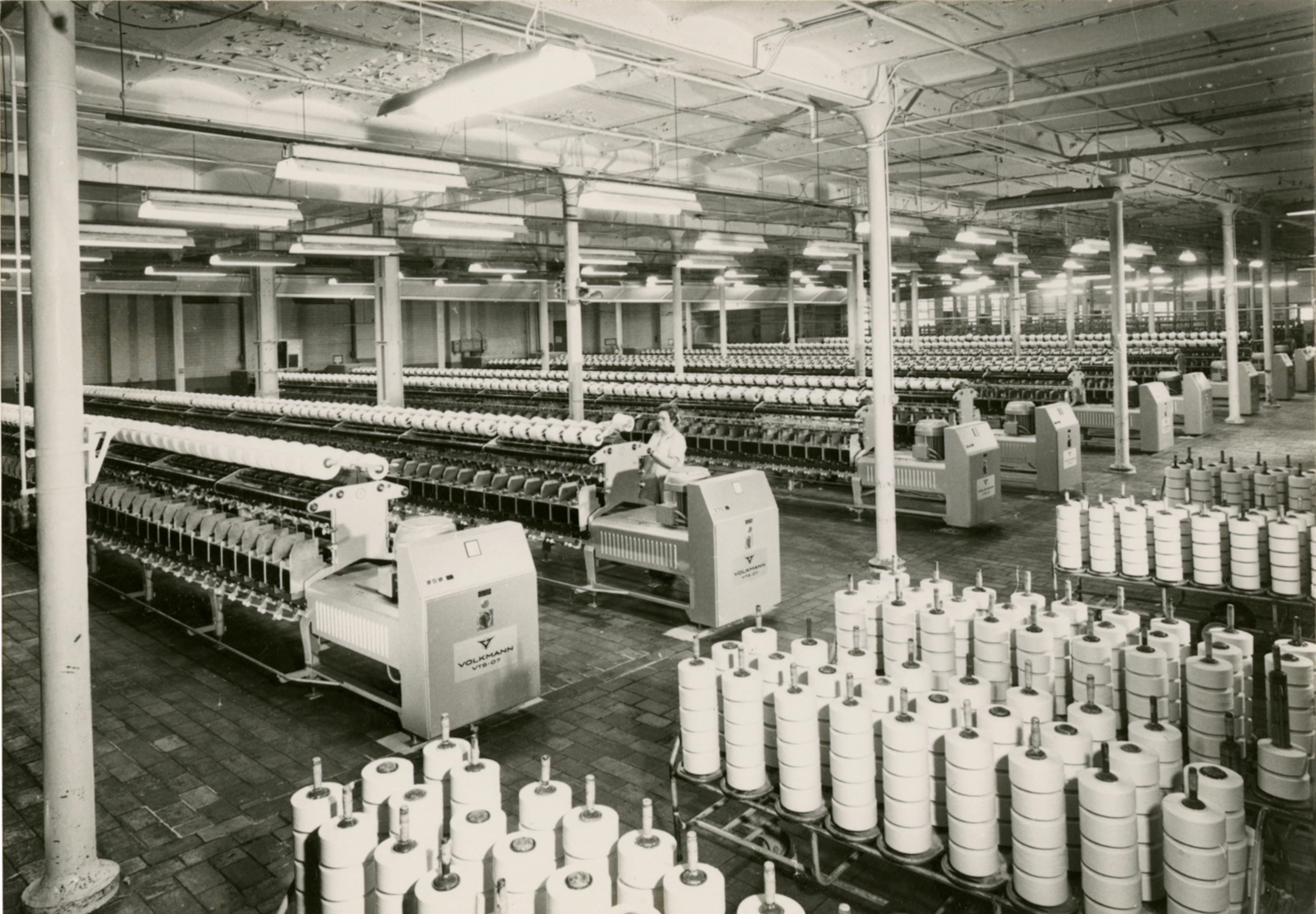 Binnenzicht van spinnerij Filature Nouvelle Orléans nv, ca. 1975.