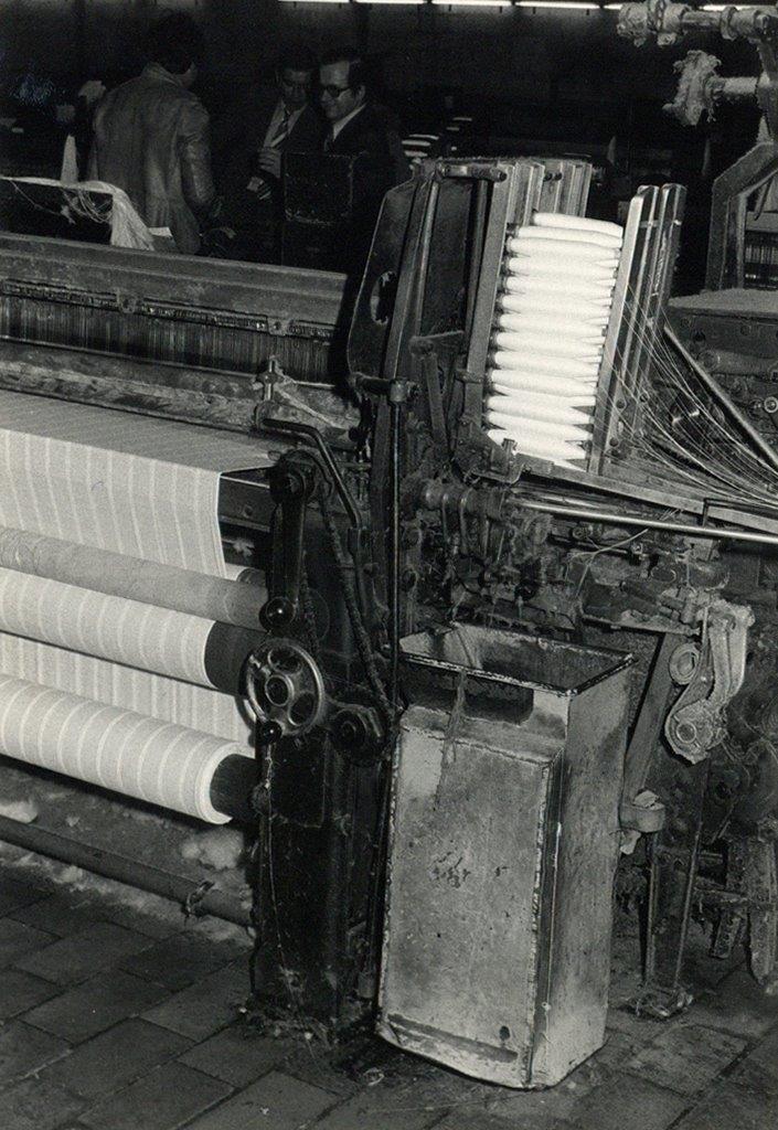 Detail van een schietspoelweefgetouw in UCO Uyttendaele, 1977. Op dit soort weefgetouw leert Edmond weven.