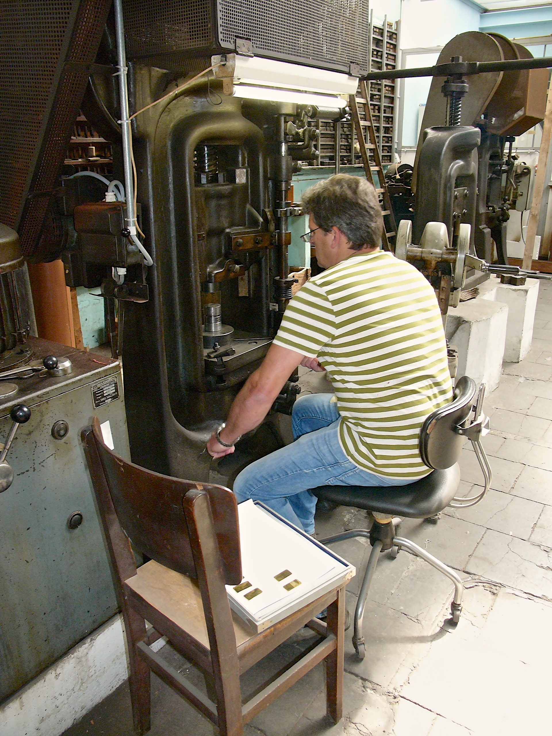 Johan aan een machine voor het slagen van de lingot, waarbij tekst en logo op de staaf worden aangebracht. Foto, eind jaren 1990. Privécollectie Johan Boschmans