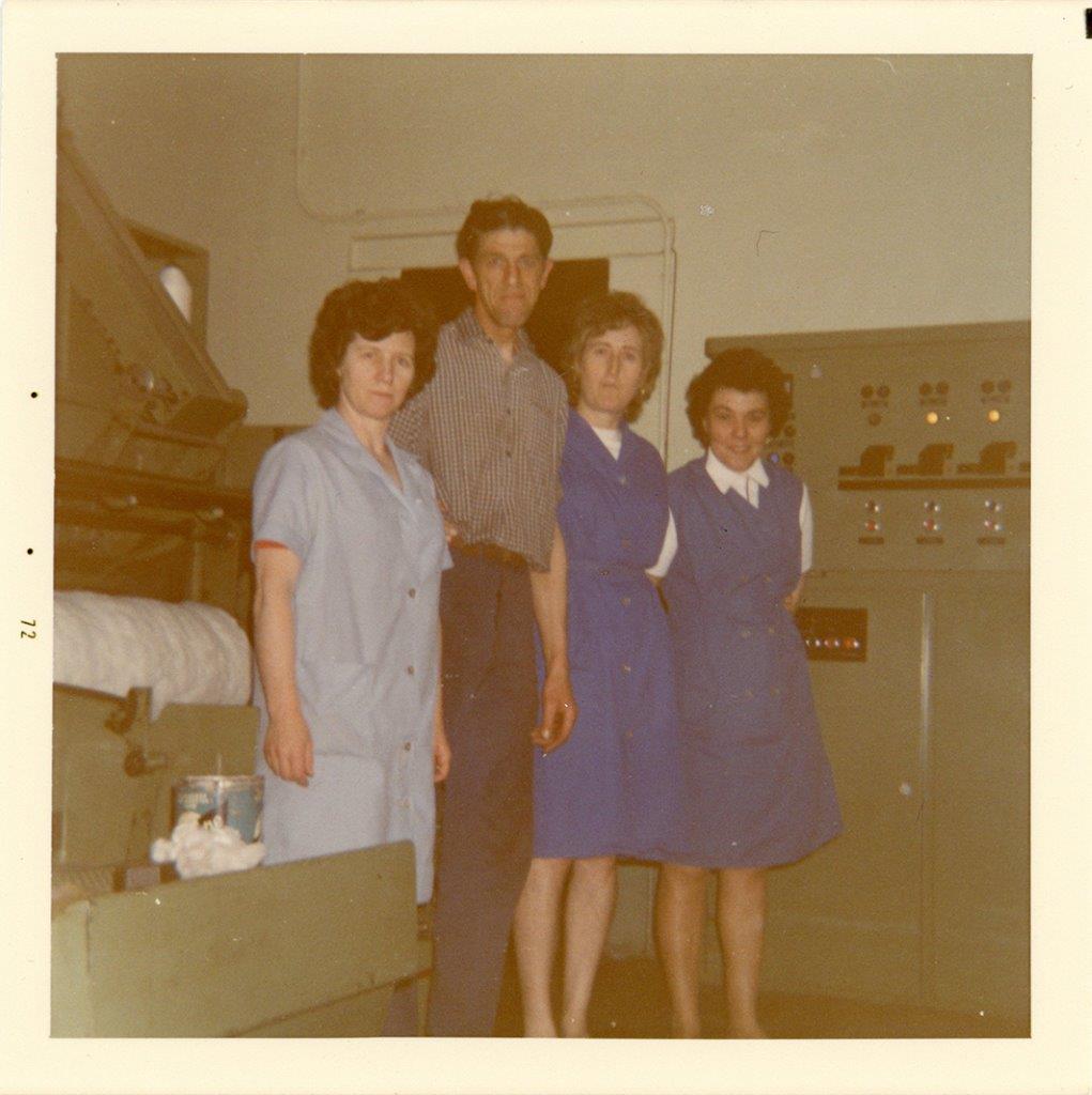 Linda (uiterst rechts) met andere arbeidsters en de meestergast in textielfabriek Filature Nouvelle Orléans nv, 1973.