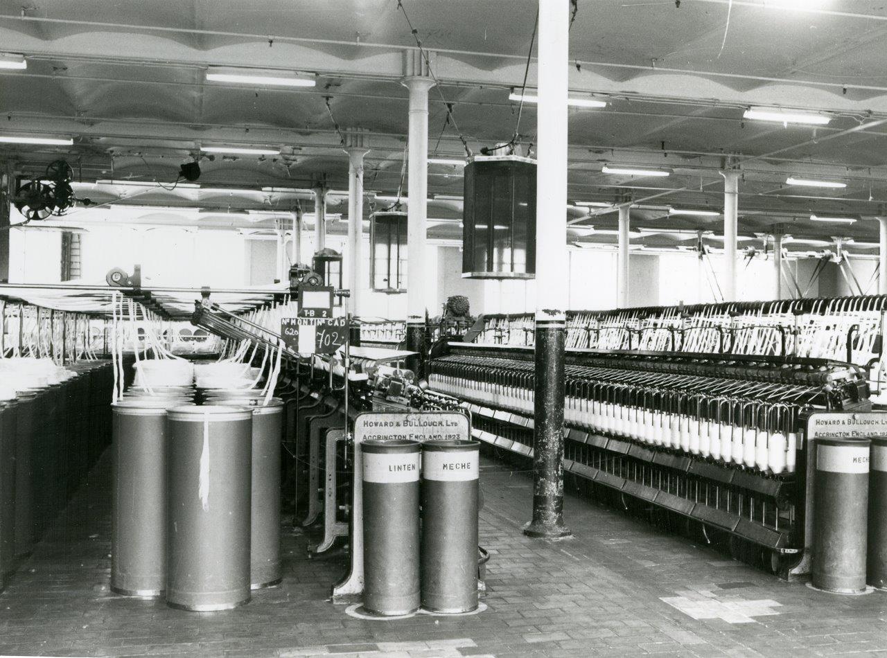 Binnenzicht van katoenspinnerij UCO Desmet-Guequier, vroeger Desmet-Guequier nv, ca. 1960-1975.